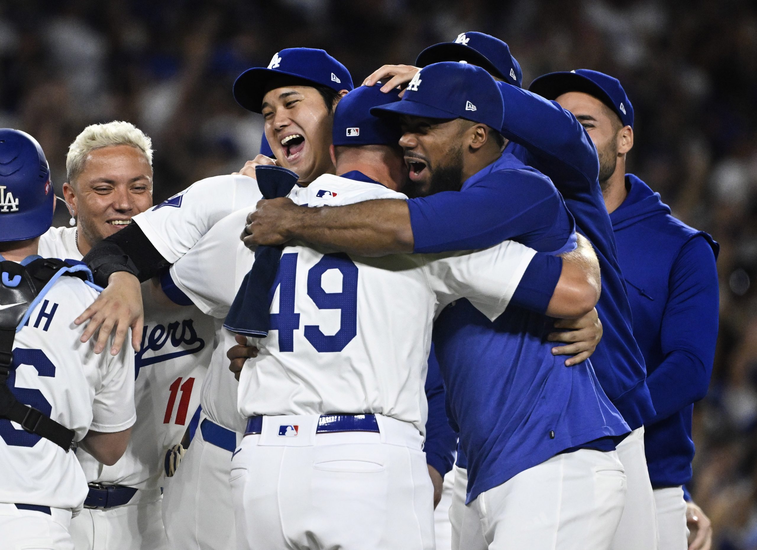 Photo Credit: Shohei Ohtani along with Teoscar Hernández hugs relief pitcher Blake Treinen #49 of the Los Angeles Dodgers after defeating the San Diego Padres 2-0 to win game 5 of the National League Division Series and move on to the NLCS against the New York Mets at Dodger Stadium in Los Angeles on Friday, October 11, 2024. (Photo by Keith Birmingham/MediaNews Group/Pasadena Star-News via Getty Images)