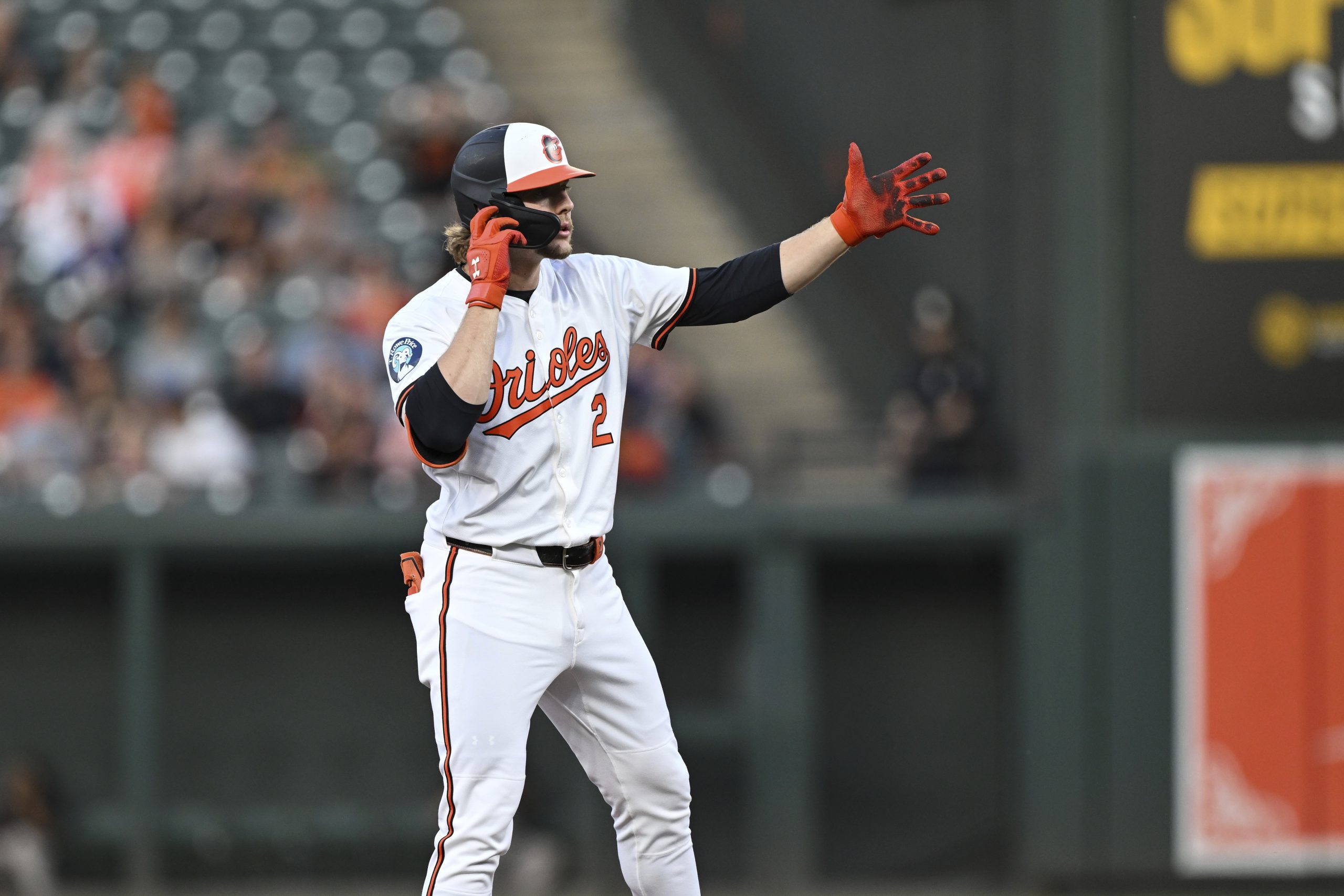 Photo Credit: Baltimore Orioles’ Gunnar Henderson gestures after hitting a double during the first inning of a baseball game against the Houston Astros, Thursday, Aug. 22, 2024, in Baltimore. (AP Photo/Terrance Williams)