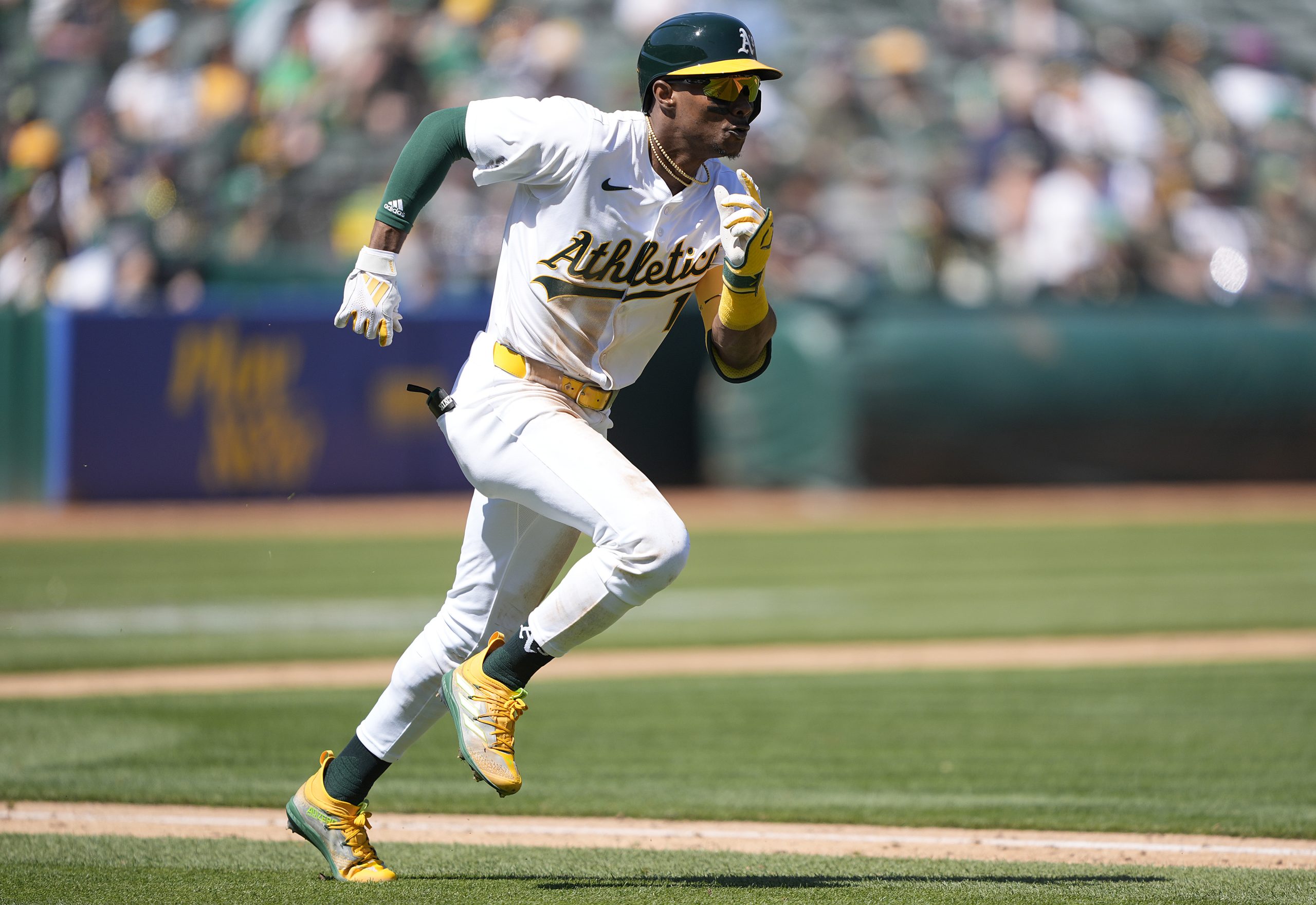 Esteury Ruiz #1 of the Oakland Athletics races around the bases on March 31, 2024, at the Oakland Coliseum in Oakland, California. (Photo by Thearon W. Henderson/Getty Images)
