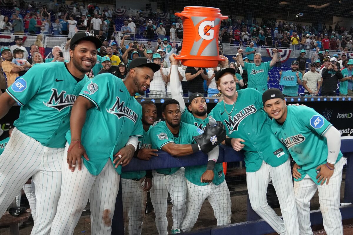 Photo: Miami Marlins players celebrate with a Gatorade shower for Owen Caissie after his walk-off two-run home run completed a sweep of the Colorado Rockies at loanDepot park, Sunday, March 29, 2026. (AP PhotoLynne Sladky) Graphic World Baseball Network