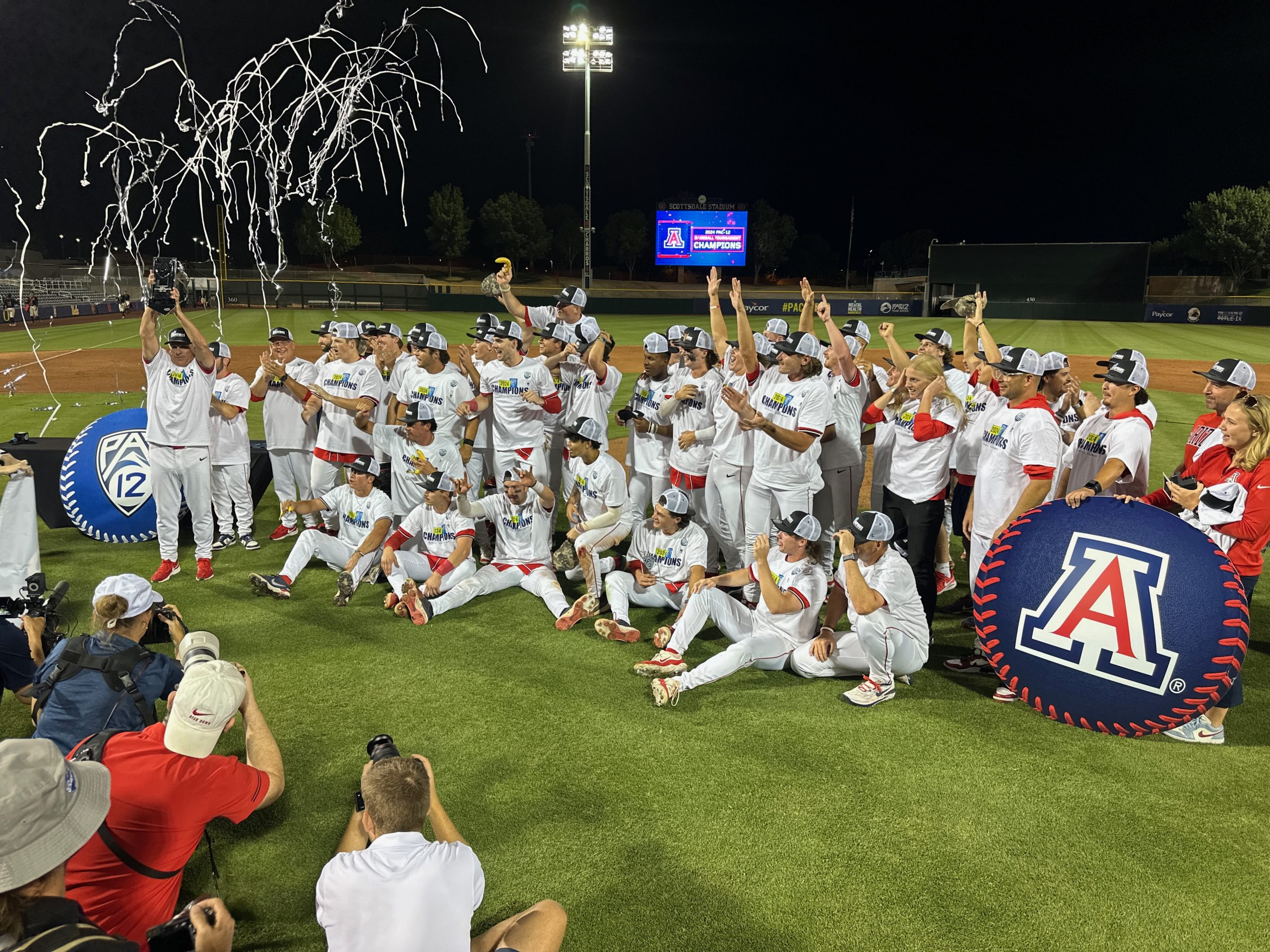 The Arizona Wildcats celebrate winning the 2024 Pac-12 Championship at Scottsdale Stadium in Scottsdale, Ariz. on May 25, 2024. (Photo by Leif Skodnick/World Baseball Network)