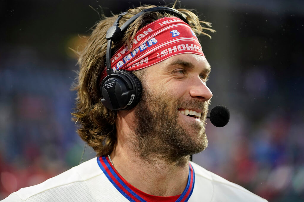 Philadelphia Phillies’ Bryce Harper smiles after the Phillies won a baseball game against the New York Mets, Saturday, Sept. 23, 2023, in Philadelphia. (AP Photo/Matt Slocum)