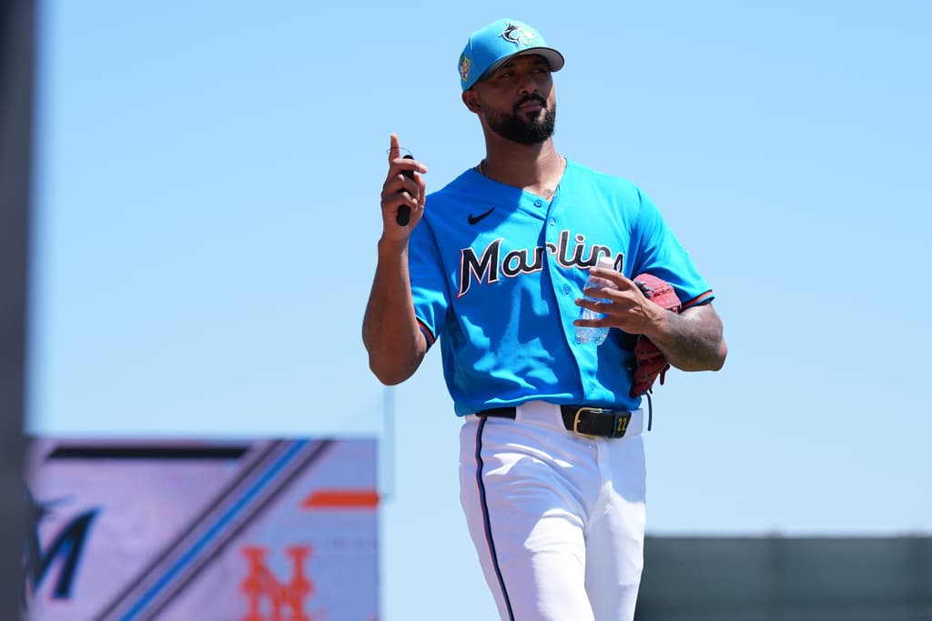Miami Marlins pitcher Sandy Alcantara gestures to fans before a spring training baseball game against the New York Mets, Sunday, March 22, 2026, in Jupiter, Fla. (AP Photo/Lynne Sladky)