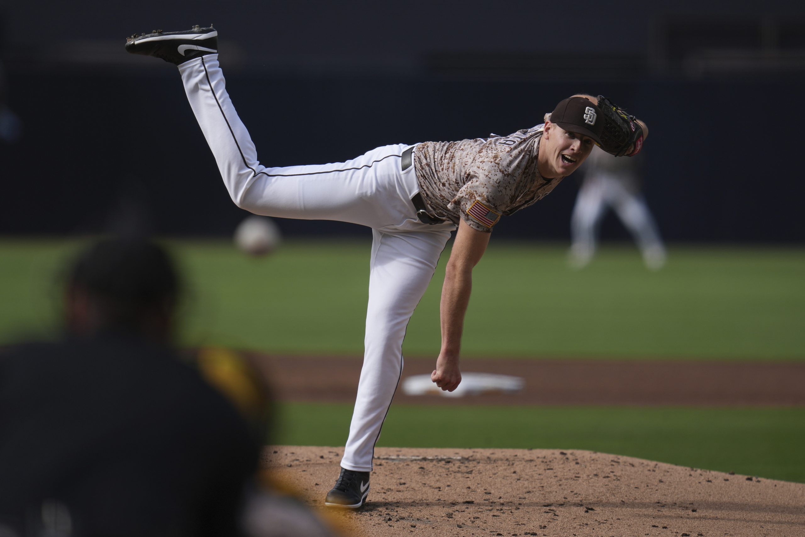 Photo: San Diego Padres starting pitcher Nick Pivetta works against an Atlanta Braves batter during the first inning of a baseball game Sunday, March 30, 2025, in San Diego. (AP Photo/Gregory Bull)