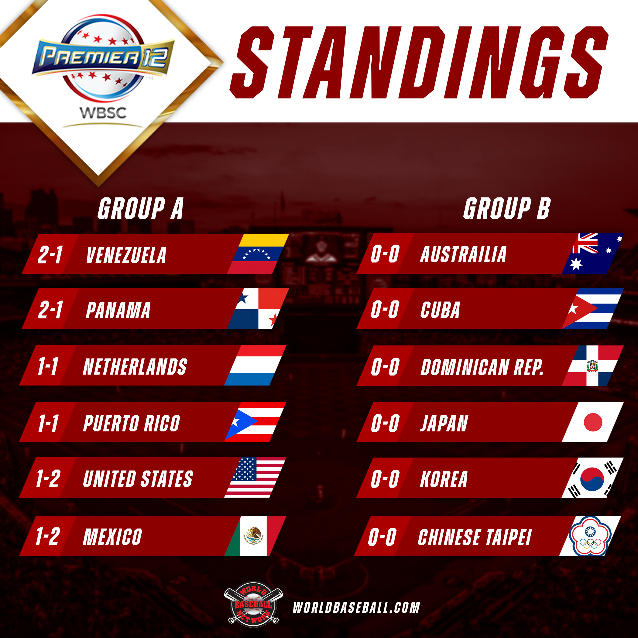 The Premier12 tournament kicked off on Saturday, with Group A beginning play in Mexico. Venezuela and Panama have jumped out to an early lead in the group, and the United States and Mexico bring up the rear with records of 1-2.