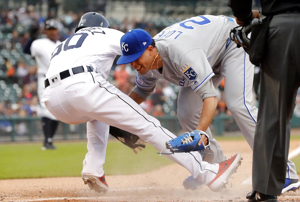 Kansas City Royals pitcher Jorge Lopez (28) knocks over Detroit Tigers’ Ronny Rodriguez (60) as Rodriguez scores on a wild pitch during the first inning of a baseball game Friday, May 3, 2019, in Detroit. (AP Photo/Carlos Osorio)