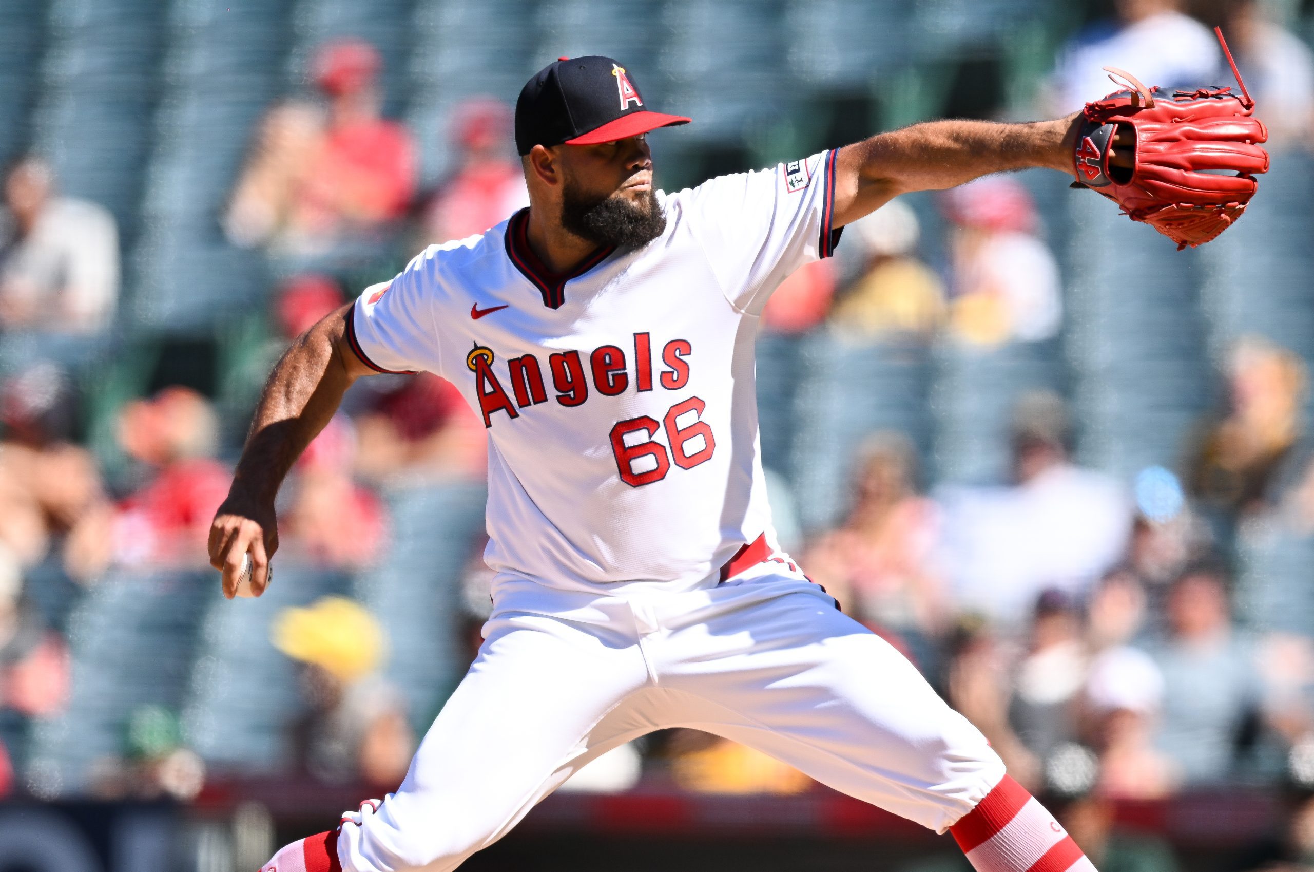 Photo Credit: Luis Garcia #66 of Los Angeles Angels pitches in the top of the ninth inning during the regular season game against the Oakland Athletics at Angel Stadium of Anaheim on July 28, 2024 in Anaheim, California. (Photo by Gene Wang/Getty Images)