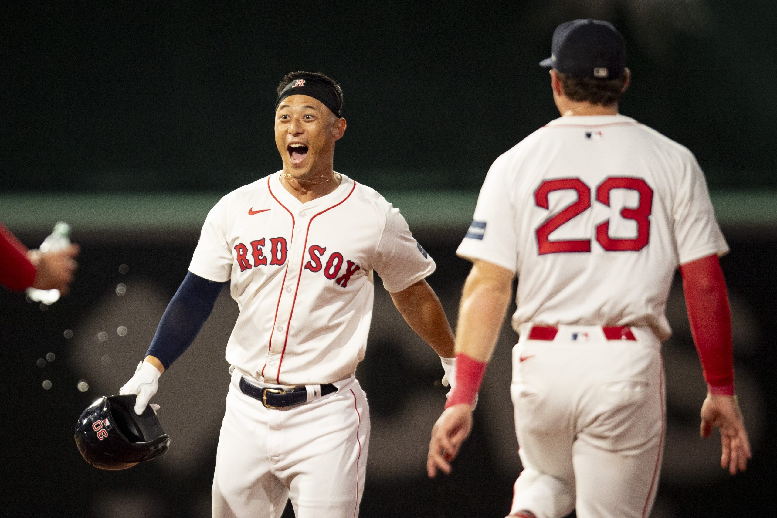 Photo Credit: Rob Refsnyder #30 is mobbed by teammates after hitting a walk-off single during the tenth inning of a game against the Texas Rangers on August 12, 2024 at Fenway Park in Boston, Massachusetts. (Photo by Maddie Malhotra/Boston Red Sox/Getty Images)