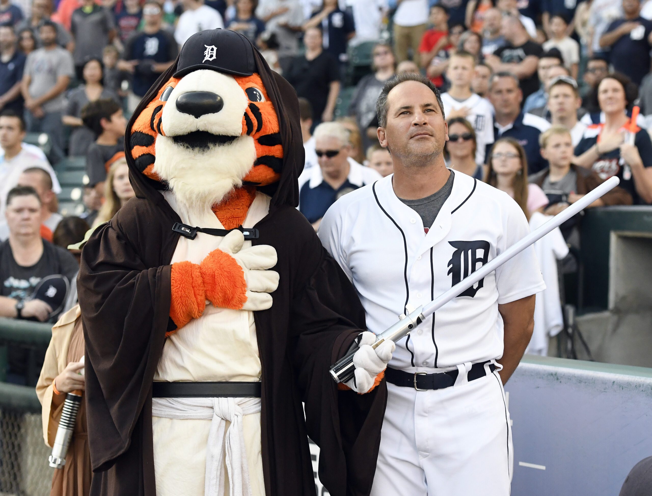 Photo: Detroit Tigers mascot Paws and first base coach Omar Vizquel (13) stand during the national anthem before a baseball game against the Chicago White Sox on Star Wars Night, Saturday, Sept. 16, 2017, in Detroit. The White Sox defeated the Tigers 10-4. (AP Photo/Jose Juarez)