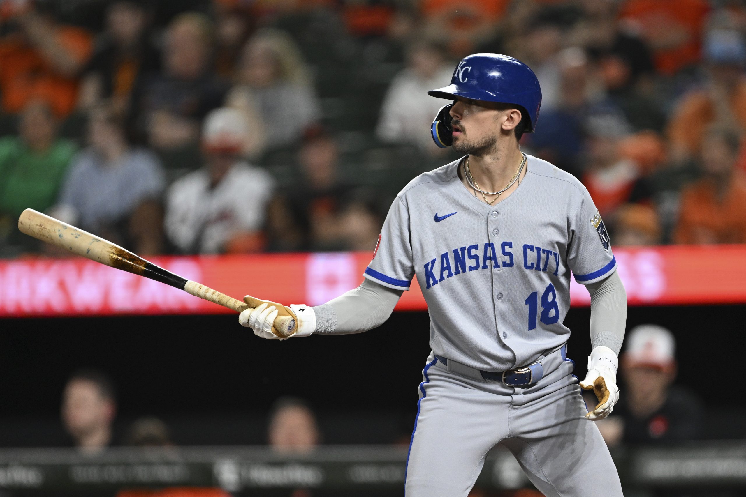 Photo: Cavan Biggio (18) at bat during the seventh inning of a baseball game against the Baltimore Orioles in Baltimore, Saturday, May 3, 2025. (AP Photo/Terrance Williams)