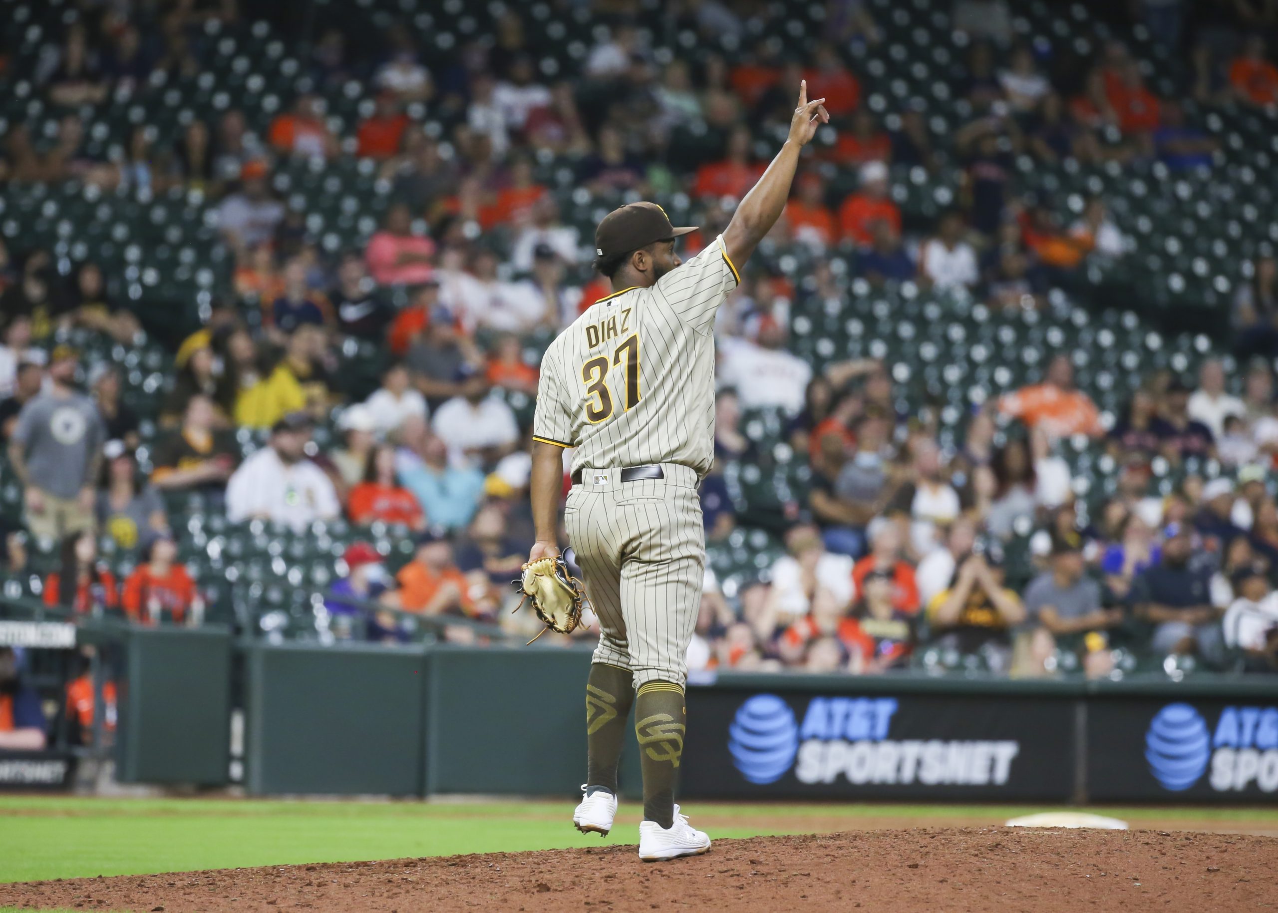 San Diego Padres relief pitcher Miguel Diaz (37) points to the outfield a Houston Astros shortstop Carlos Correa (1) hits a pop fly in the bottom of the twelfth inning during the baseball game between the San Diego Padres and Houston Astros on May 29, 2021 at Minute Maid Park in Houston, Texas. (Photo by Leslie Plaza Johnson/Icon Sportswire via Getty Images)