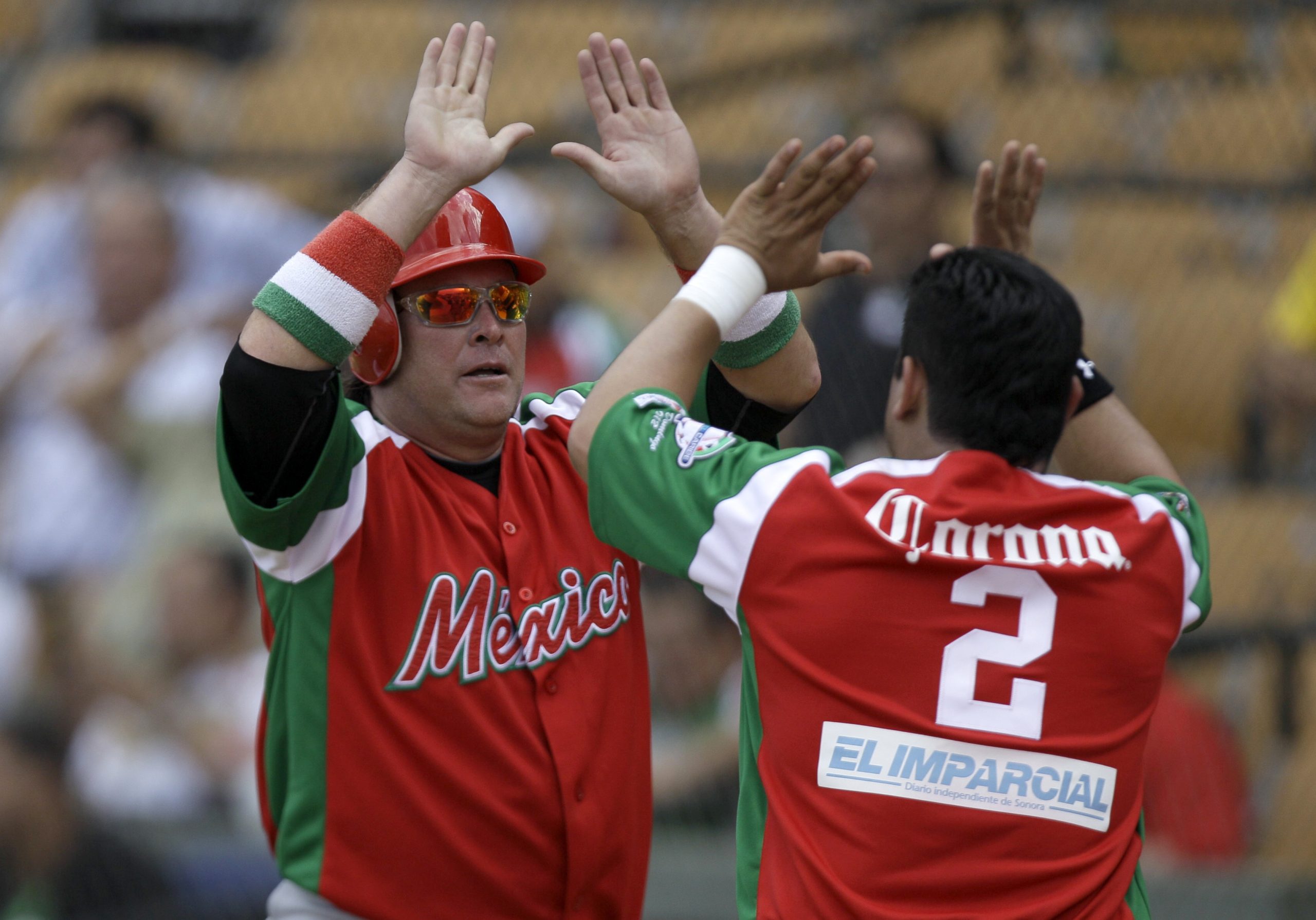 Photo: Mexico’s Karim Garcia, left, celebrates with teammate Sergio Contreras after scoring a run during a Caribbean Series baseball game against Puerto Rico at Quisqueya stadium in Santo Domingo, Dominican Republic, Monday, Feb. 6, 2012. (AP Photo/Fernando Llano)