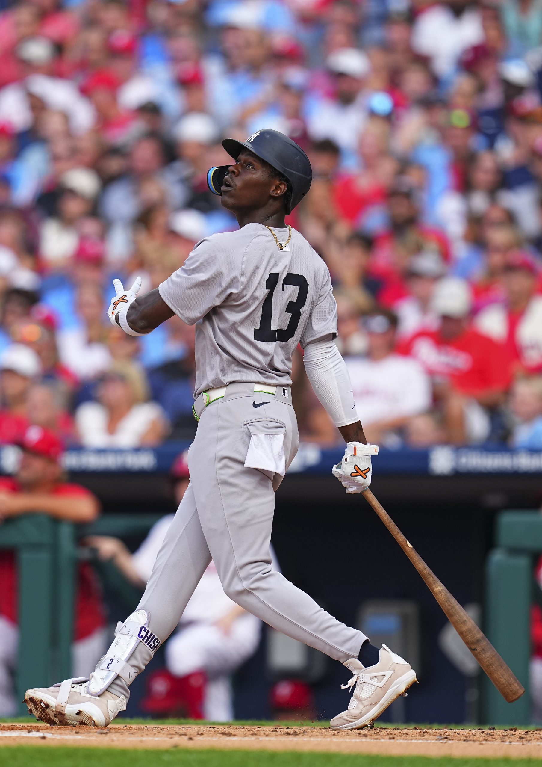 Photo Credit: Jazz Chisholm Jr. #13 of the New York Yankees hits a solo home run in the top of the second inning against the Philadelphia Phillies at Citizens Bank Park on July 29, 2024 in Philadelphia, Pennsylvania. (Photo by Mitchell Leff/Getty Images)