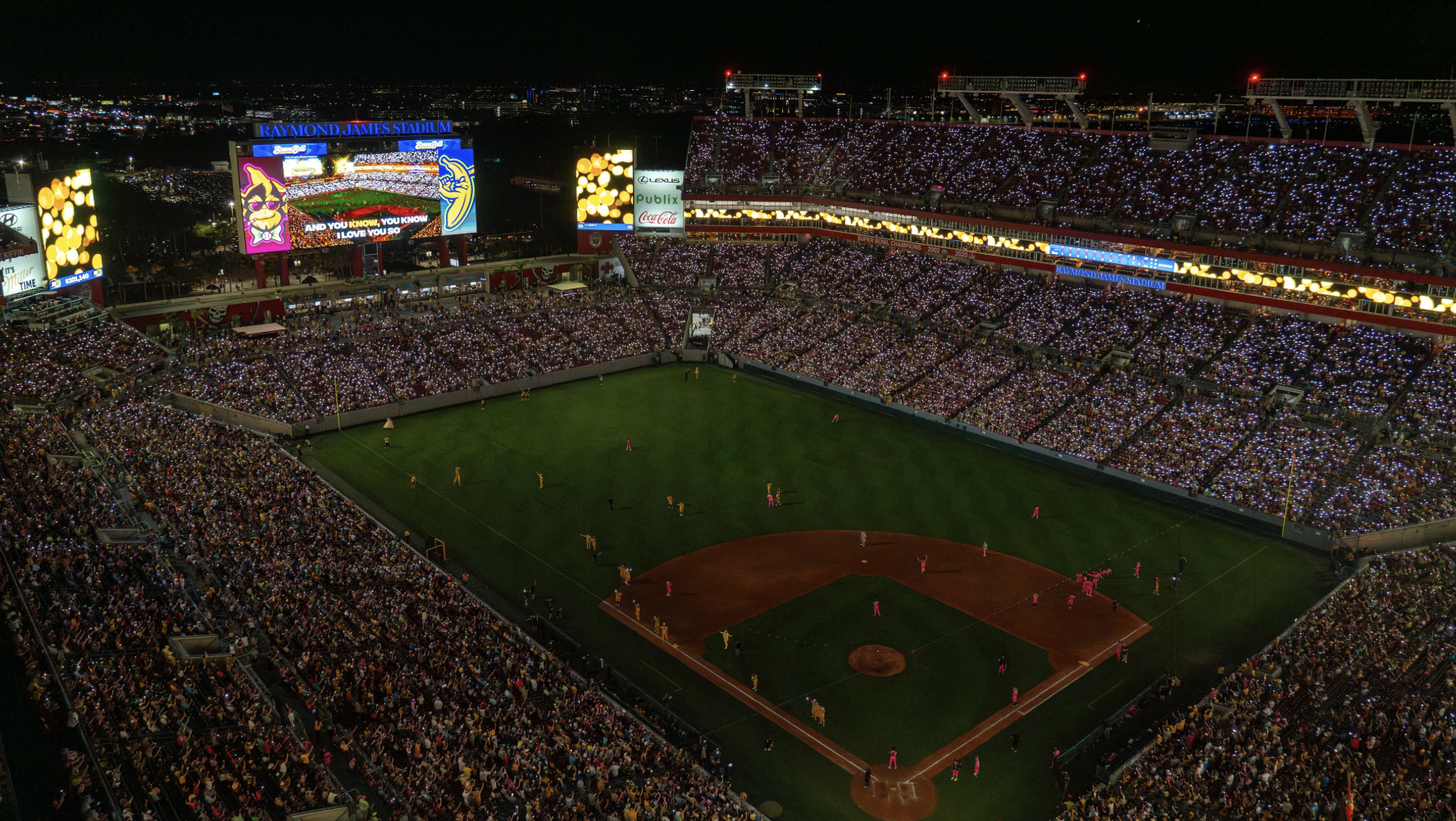 Raymond James Stadium is best known for hosting Super Bowls, playoff battles, and the legendary Tom Brady era in Tampa. The Buccaneers’ massive pirate ship, which looms over the north end zone, has celebrated countless touchdowns—but on this night, it served as the surreal backdrop for one of the most unconventional baseball games ever played.