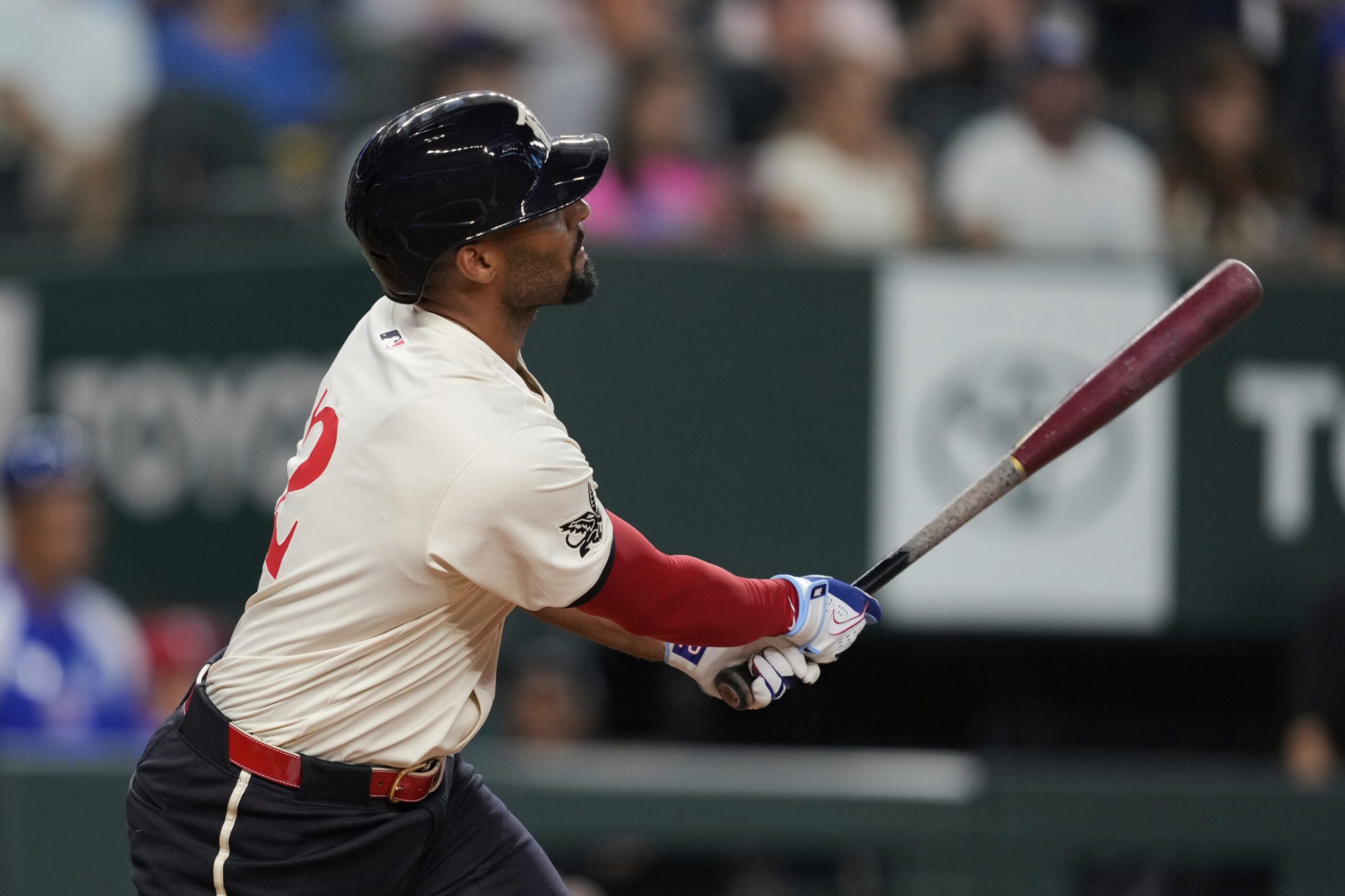 Photo: Texas Rangers’ Marcus Semien follows through on a sacrifice fly that scored Sam Haggerty in the first inning of a baseball game against the Atlanta Braves Friday, July 25, 2025, in Arlington, Texas. (AP Photo/Tony Gutierrez)