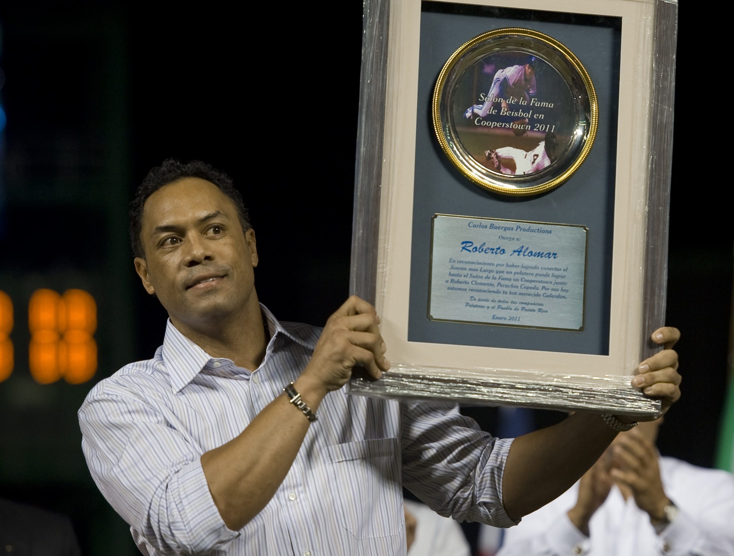 Photo Credit: Puerto Rican second baseman Roberto Alomar, who recently became a Hall of Famer, shows the recognition received on behalf of Puerto Rican players. (OMAR TORRES/AFP via Getty Images)