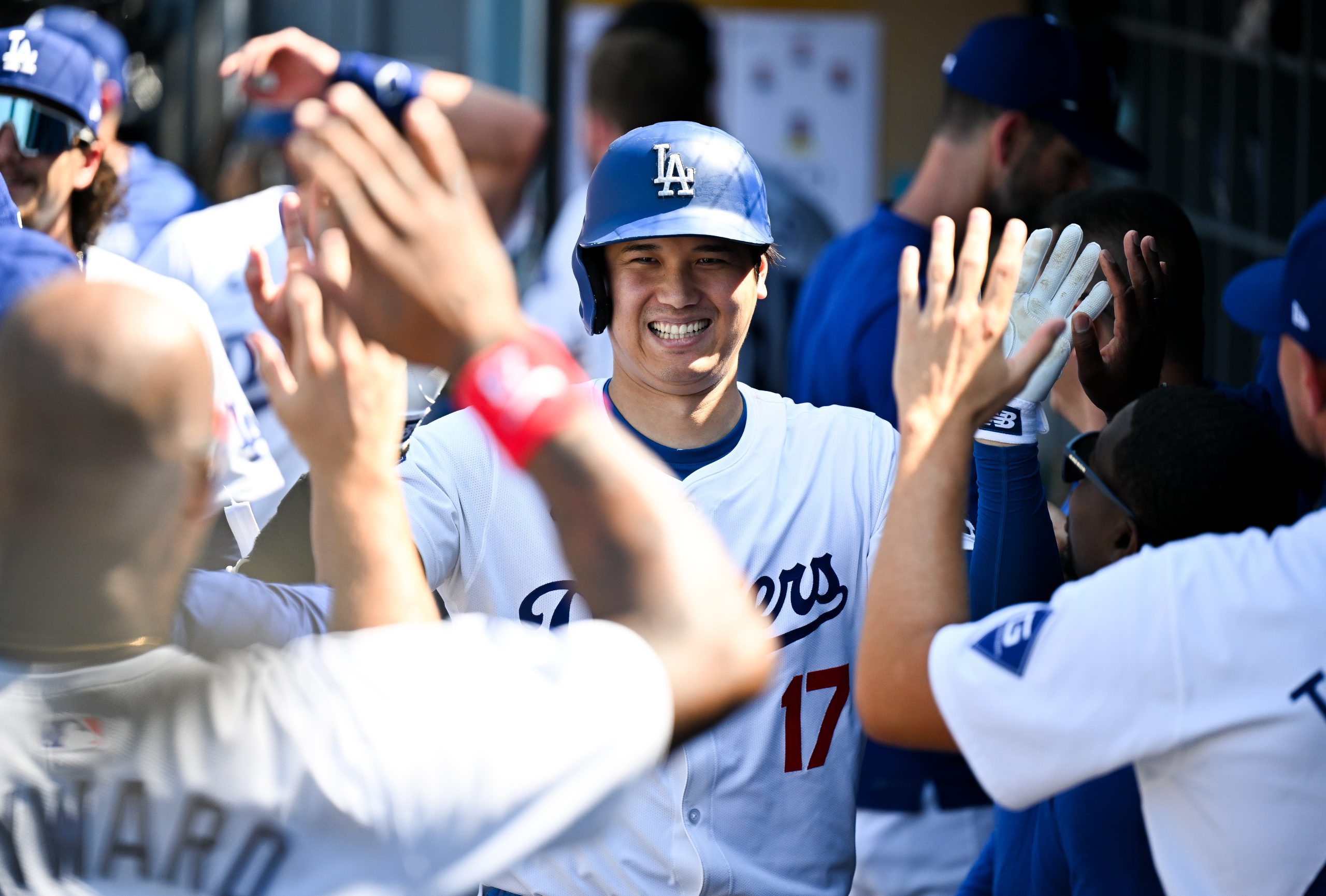 Photo Credit: Shohei Ohtani #17 of Los Angeles Dodgers celebrates with teamates after hitting a solo homerun in the bottom of the eighth inning during the regular season game against the San Francisco Giants. (Photo by Gene Wang/Getty Images)