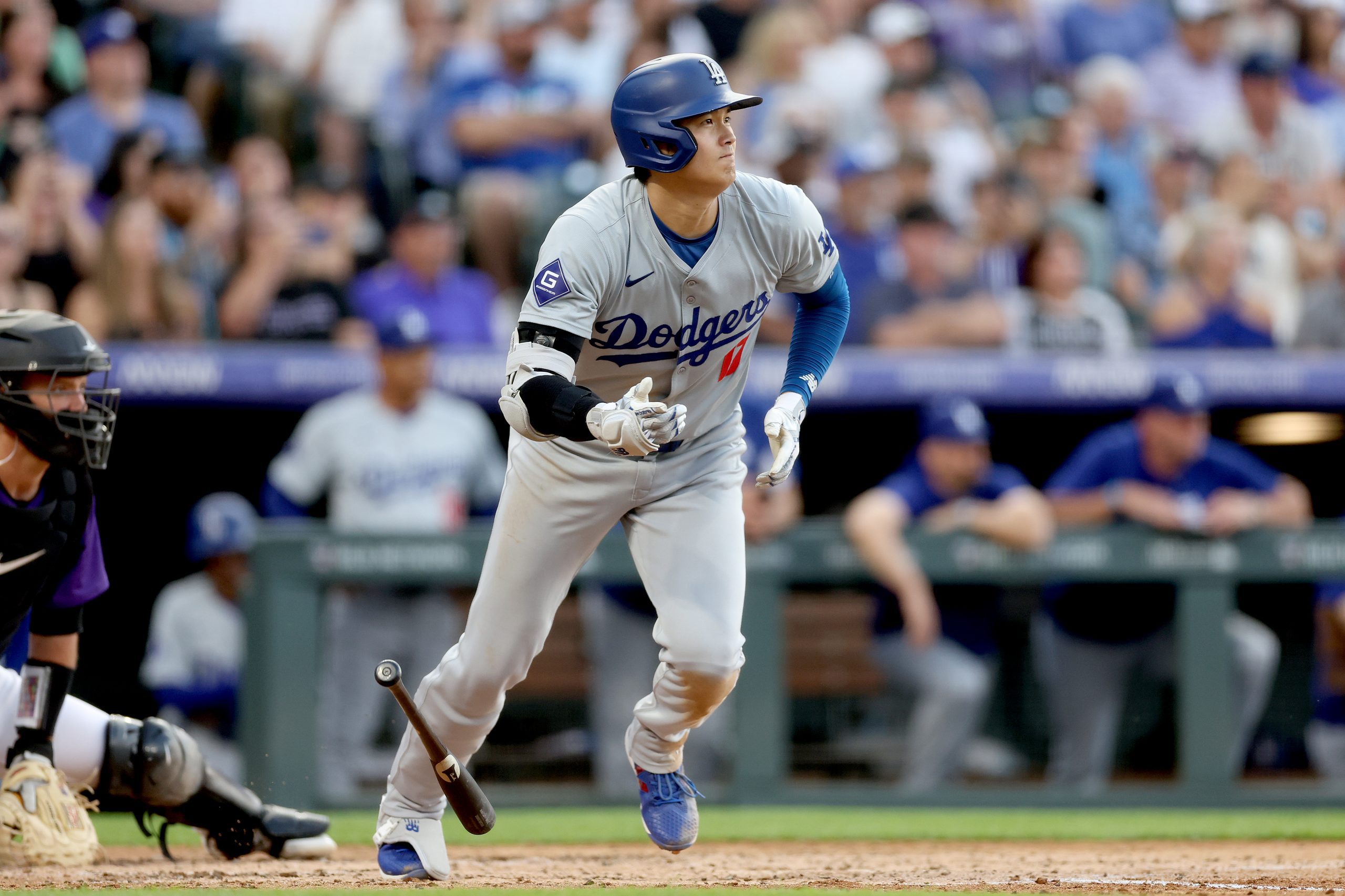 Shohei Ohtani #17 of the Los Angeles Dodgers hits a double against the Colorado Rockies. (Photo by Matthew Stockman/Getty Images)