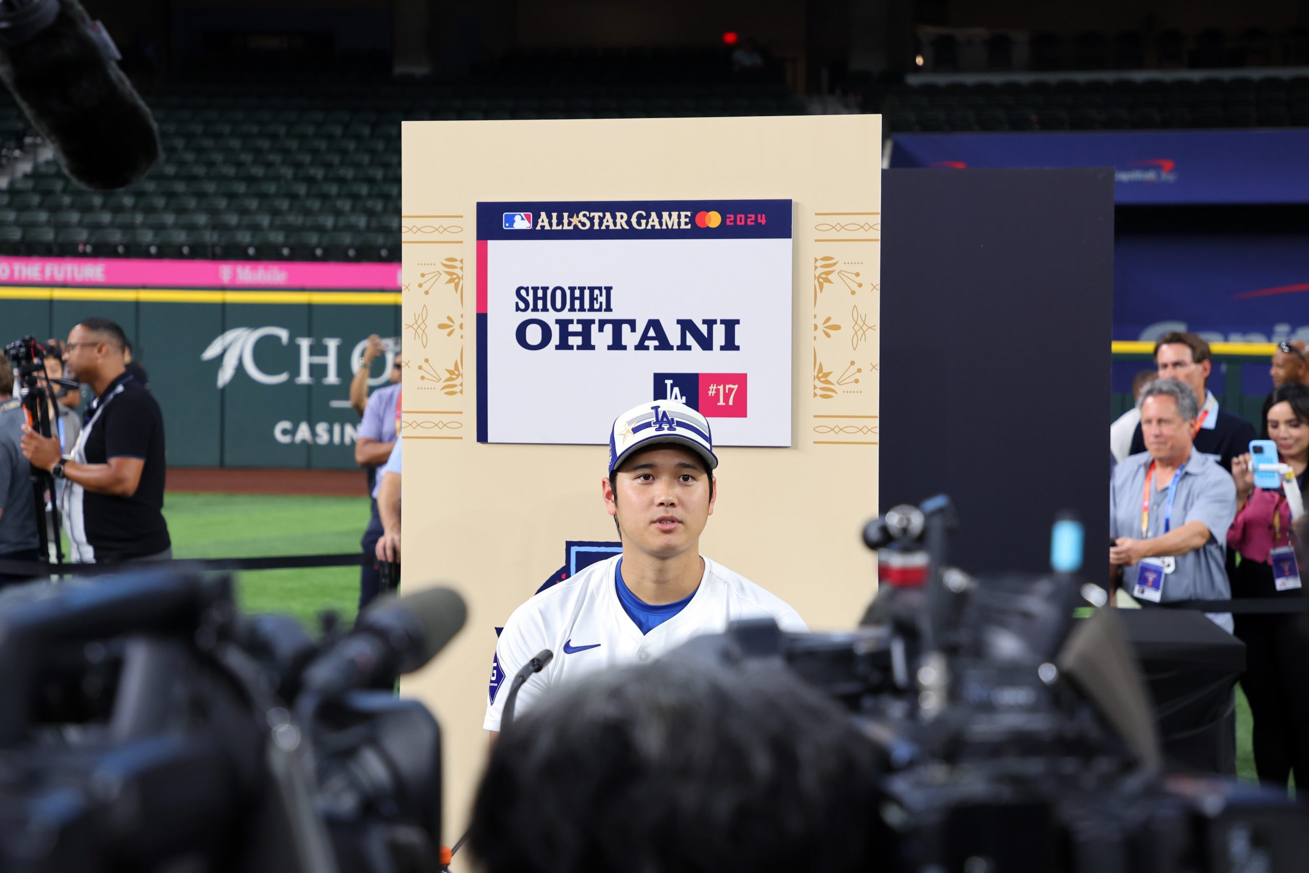 Photo Credit: Shohei Ohtani #17 of the Los Angeles Dodgers speaks to the media during Gatorade All-Star Workout Day at Globe Life Field on July 15, 2024 in Arlington, Texas. (Photo by Stacy Revere/Getty Images)