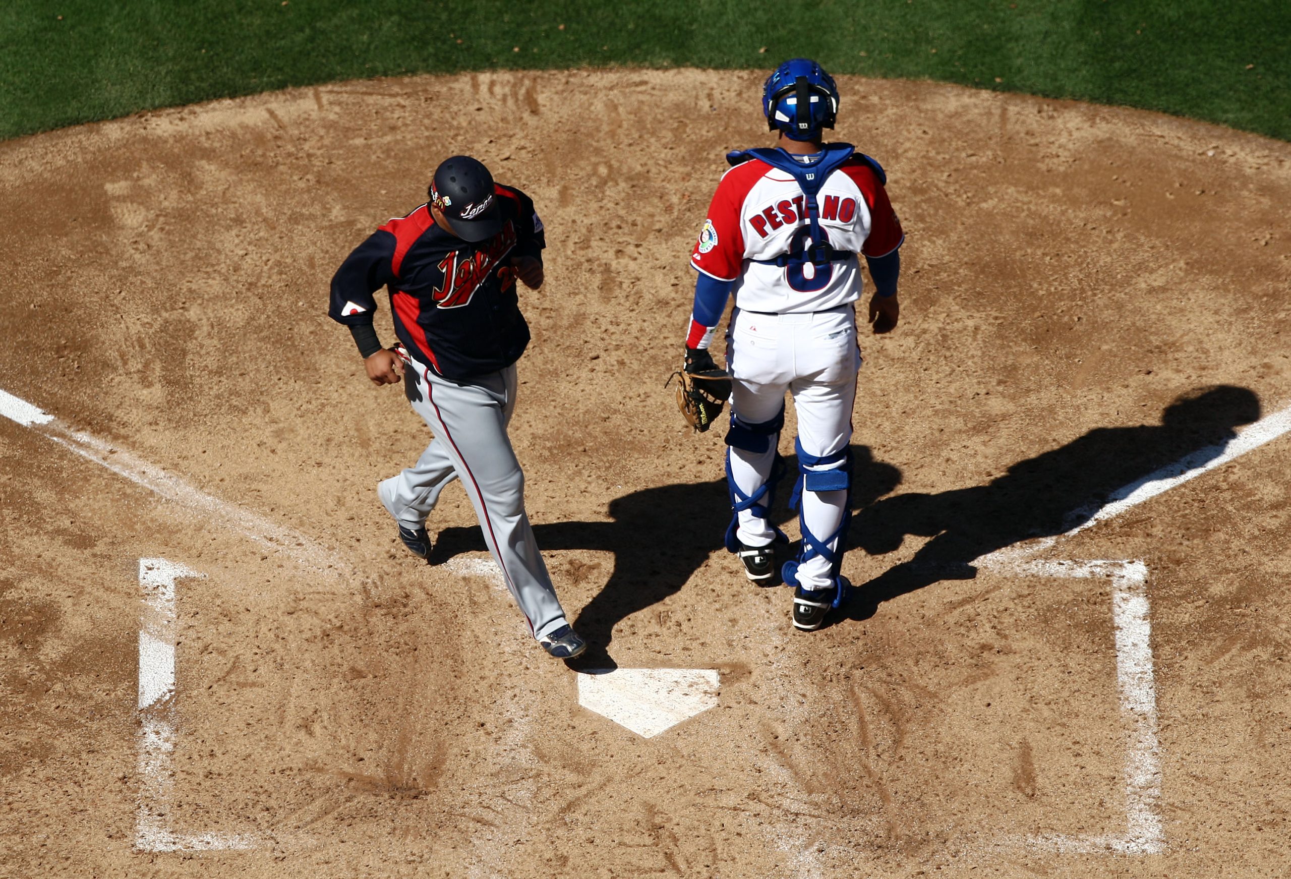 Norichika Aoki #7 of Japan steps on home plate to score a run against Ariel Pestano #8. (Photo by Donald Miralle/Getty Images)