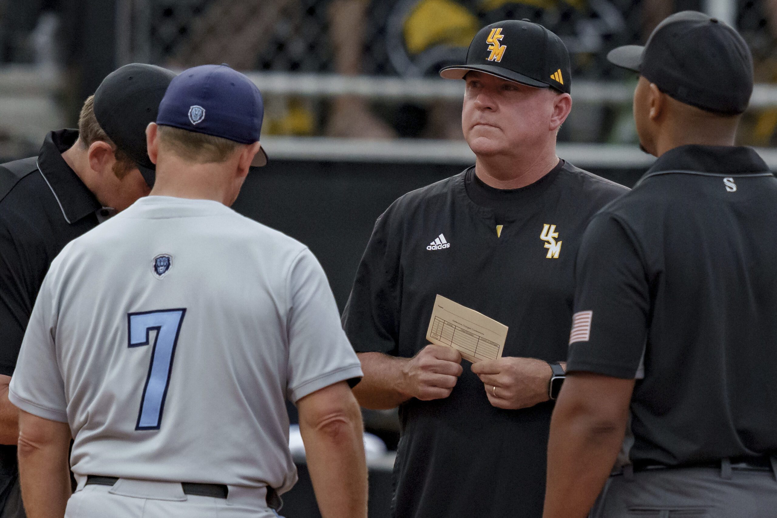 PHOTO: Southern Mississippi head coach Christian Ostrander talks before an NCAA regional baseball game against Columbia on Friday, May 30, 2025, in Hattiesburg, Miss. (AP Photo/Matthew Hinton)