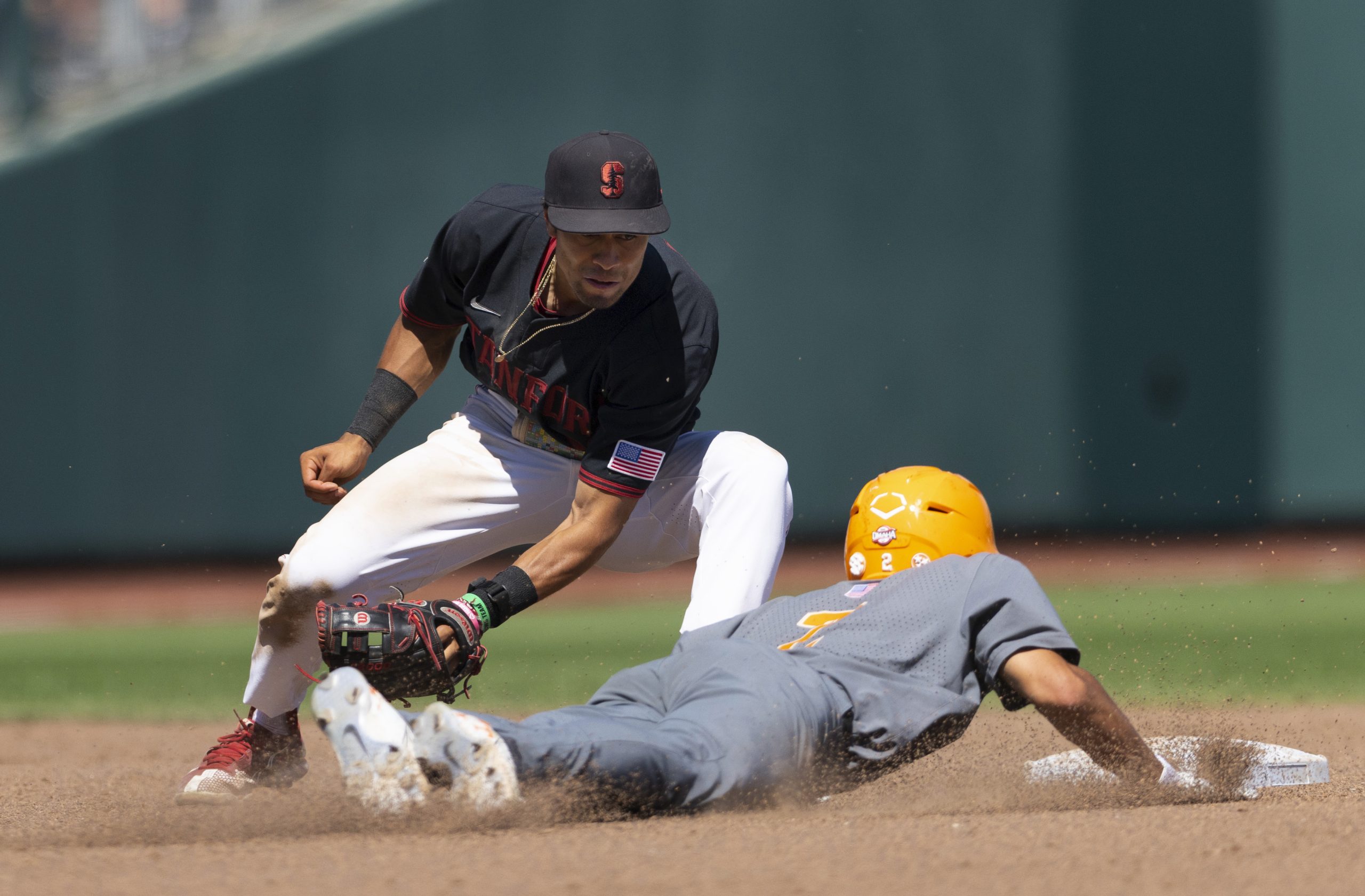 Photo: Stanford’s Temo Becerra, left, tags out Tennessee’s Maui Ahuna, right, on a steal-attempt at second base in the eighth inning of a baseball game at the NCAA College World Series in Omaha, Neb., Monday, June 19, 2023. (AP Photo/Rebecca S. Gratz)