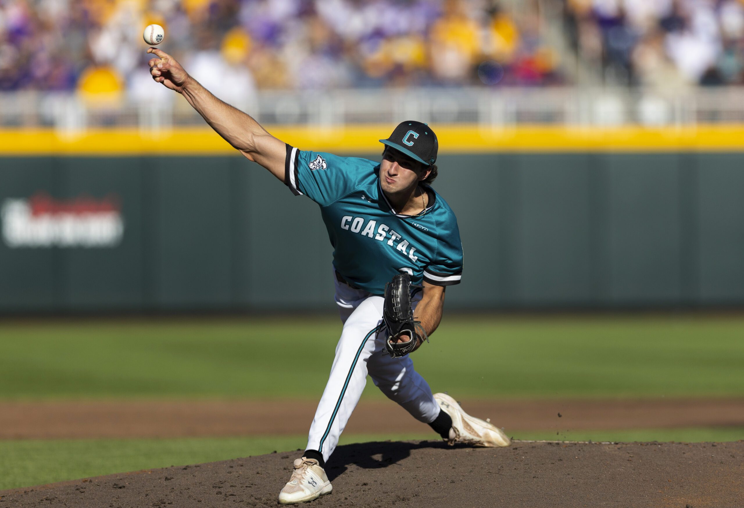 Photo: Coastal Carolina starting pitcher Cameron Flukey throws against LSU in the first inning of Game 1 of the NCAA College World Series baseball finals in Omaha, Neb., Saturday, June 21, 2025. (AP Photo/Rebecca S. Gratz)