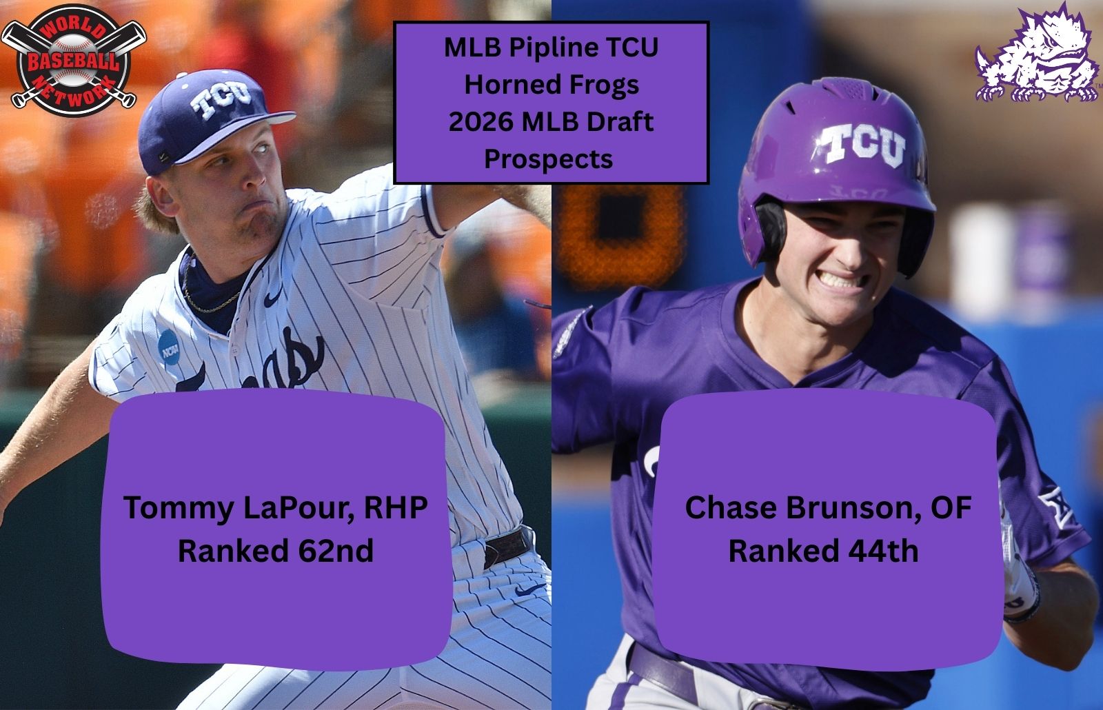 However, the Horned Frogs have two other players with tons of draft stock. According to MLB Pipeline, outfielder Chase Brunson and right-handed pitcher Tommy LaPour are top 75 MLB Draft prospects heading into 2026.