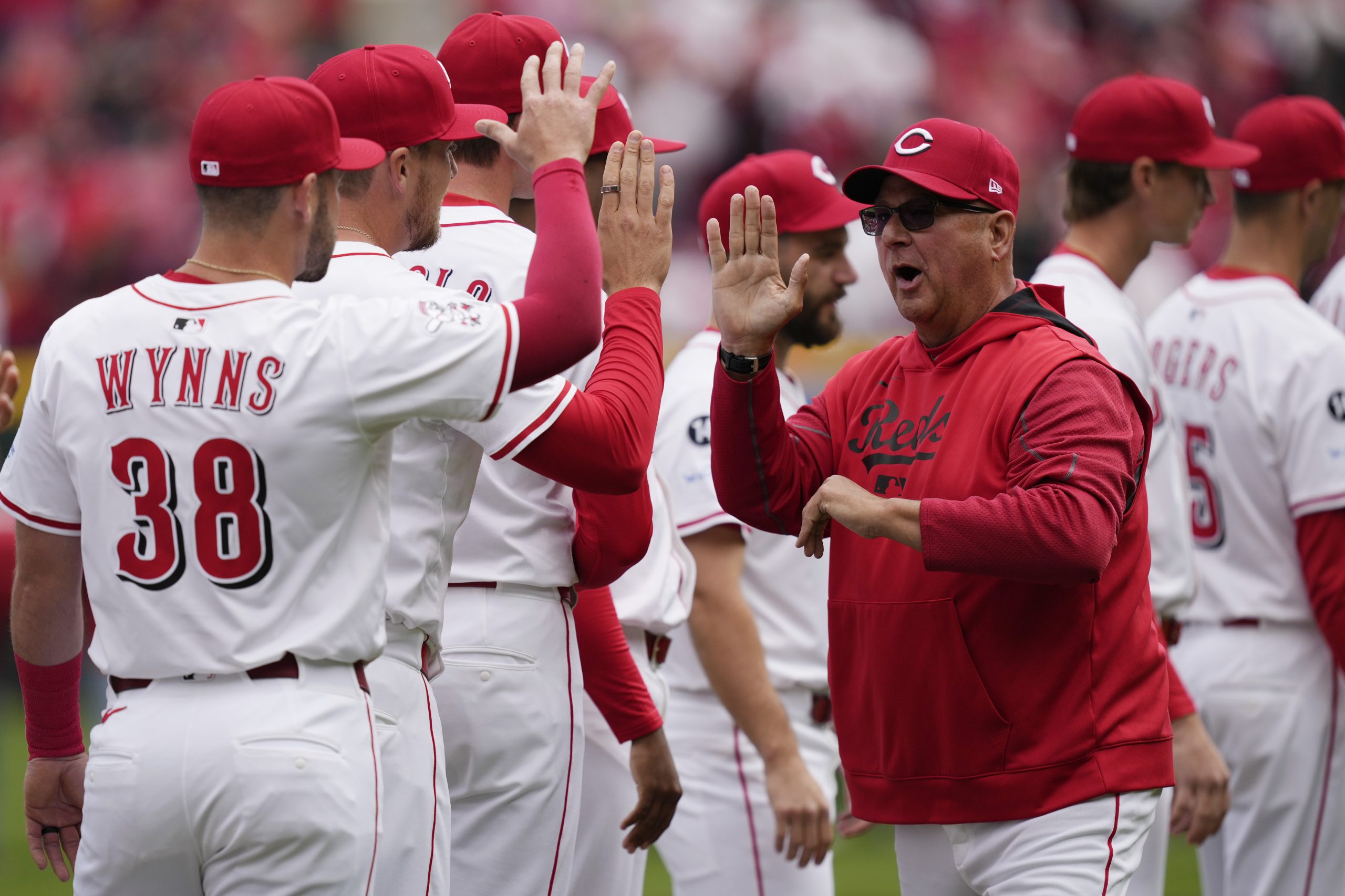 Photo: Cincinnati Reds manager Terry Francona greets players on the field as he is introduced before an opening-day baseball game against the San Francisco Giants, Thursday, March, 27, 2025, in Cincinnati. (AP Photo/Carolyn Kaster)