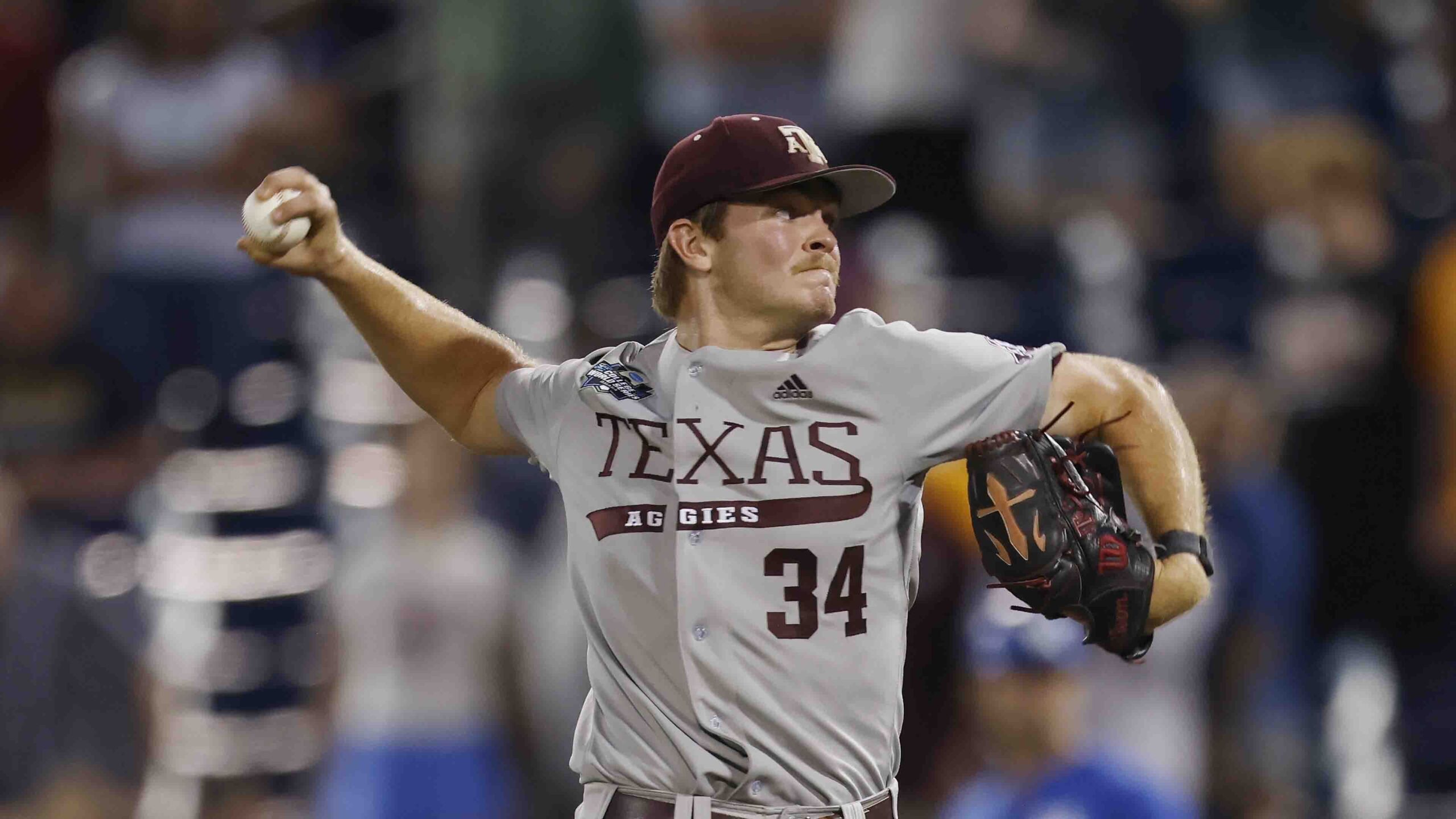 PHOTO: Texas A&M pitcher Josh Stewart (34) in action during an NCAA College World Series baseball game against Kentucky on Monday, June 17, 2024, in Omaha, Neb. Texas A&M won 5-1. (AP Photo/Mike Buscher)