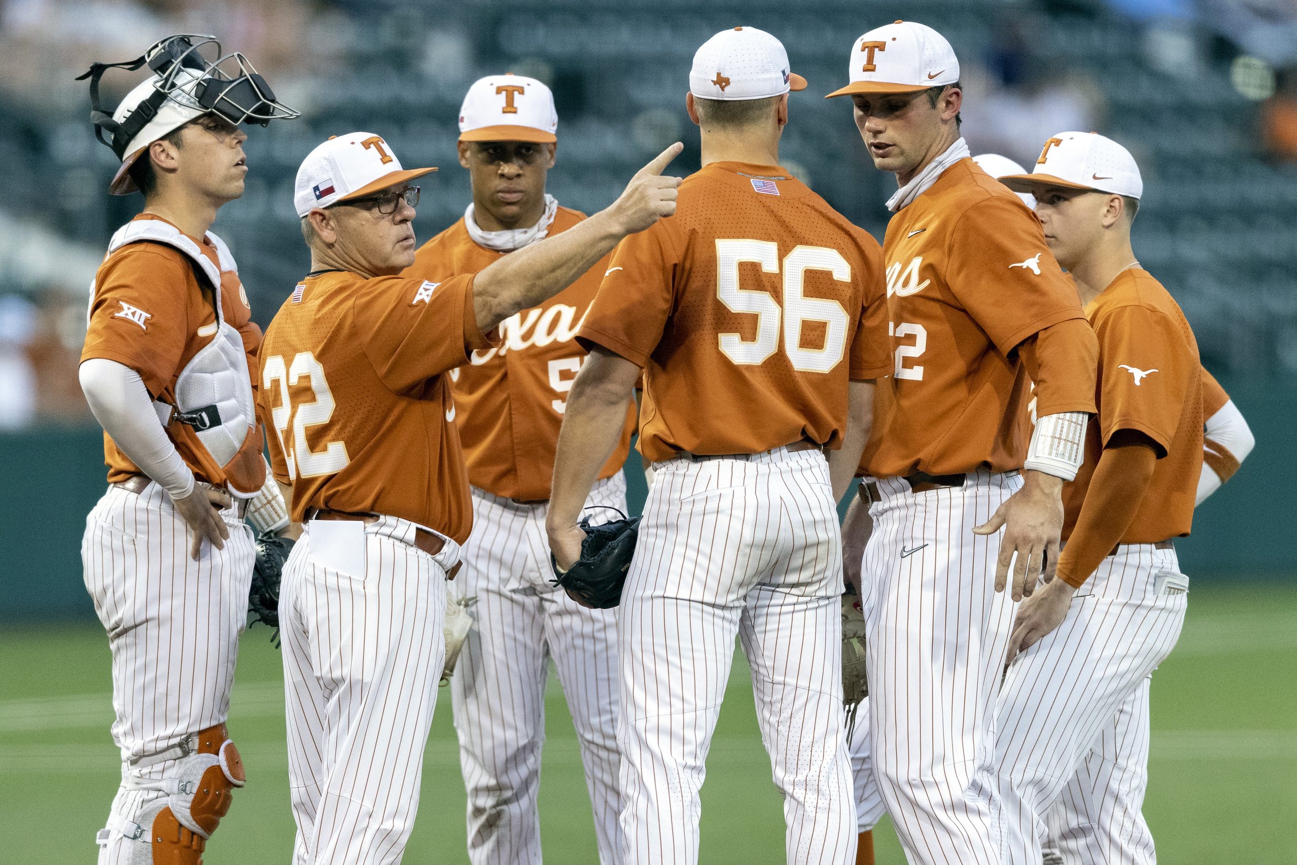 Photo Credit: Texas head coach David Pierce pulls pitcher Justin Eckhardt (56) during an NCAA baseball game against Nevada in Austin, Texas. Texas is making its record 37th appearance in the College World Series. Unlike the last time it was in Omaha in 2018, coach Pierce believes this Longhorns team has the makings of a national champion. (AP Photo/Stephen Spillman, April 13, 2021)