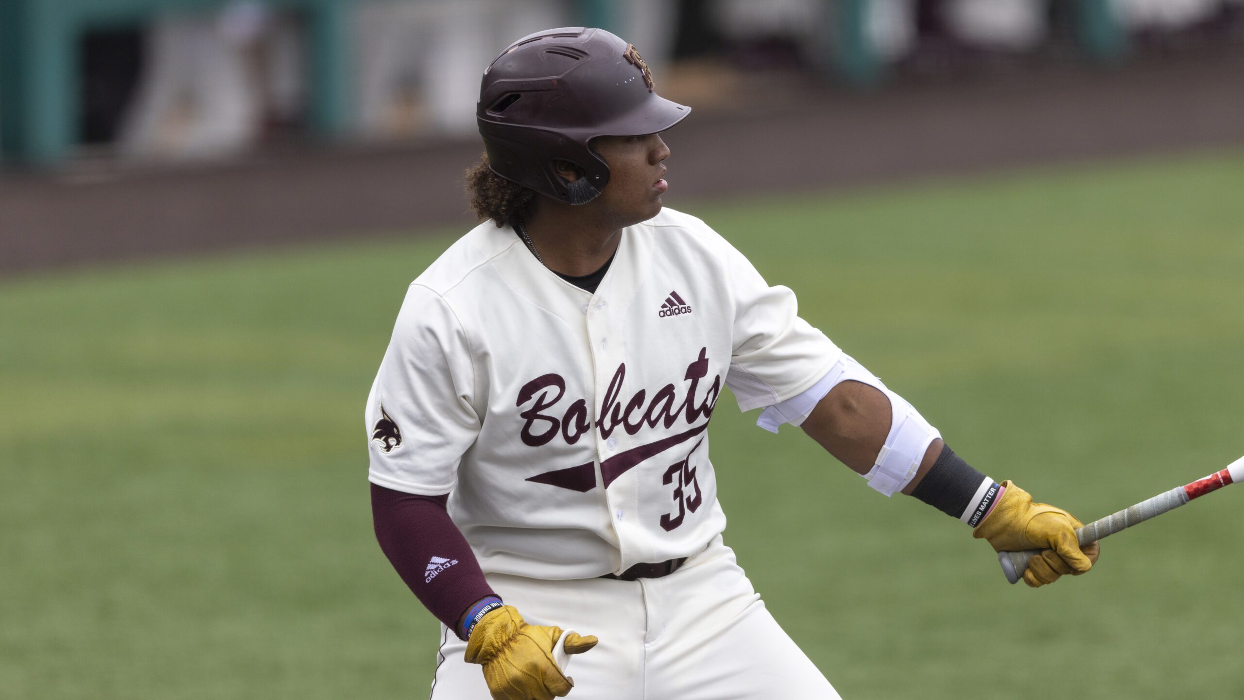 PHOTO: Texas State catcher Rashawn Galloway (35) bats against Oral Roberts during an NCAA baseball game on Sunday, Feb. 26, 2023, in San Marcos, Texas. (AP Photo/Stephen Spillman)