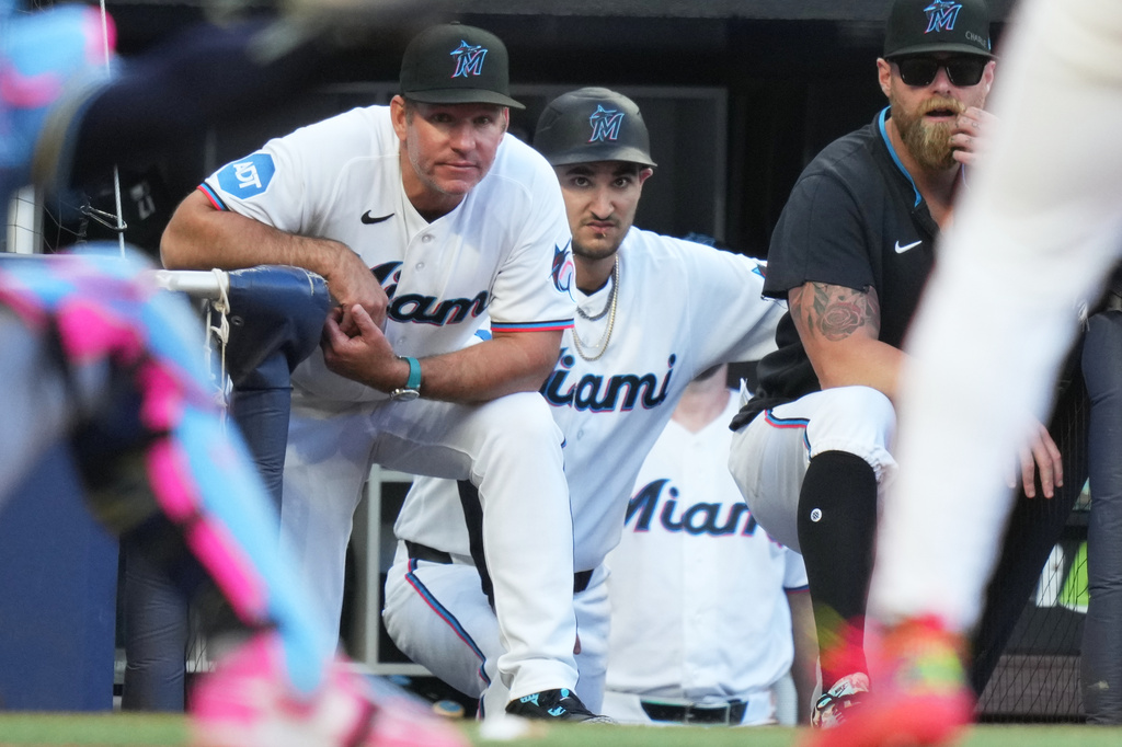 Miami Marlins manager Clayton McCullough, left, watches from the dugout during the eighth inning of a baseball game against the Milwaukee Brewers, Saturday, April 18, 2026, in Miami. (AP Photo/Lynne Sladky)