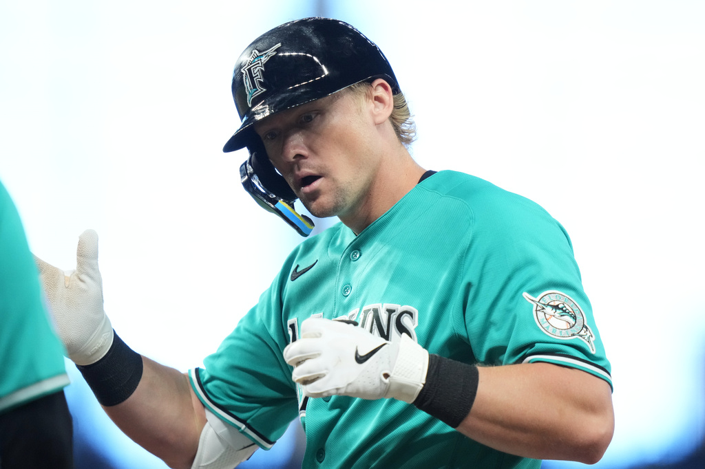 Miami Marlins Kyle Stowers reacts after hitting a single during the ninth inning of a baseball game against the Milwaukee Brewers, Sunday, April 19, 2026, in Miami. (AP Photo/Lynne Sladky)