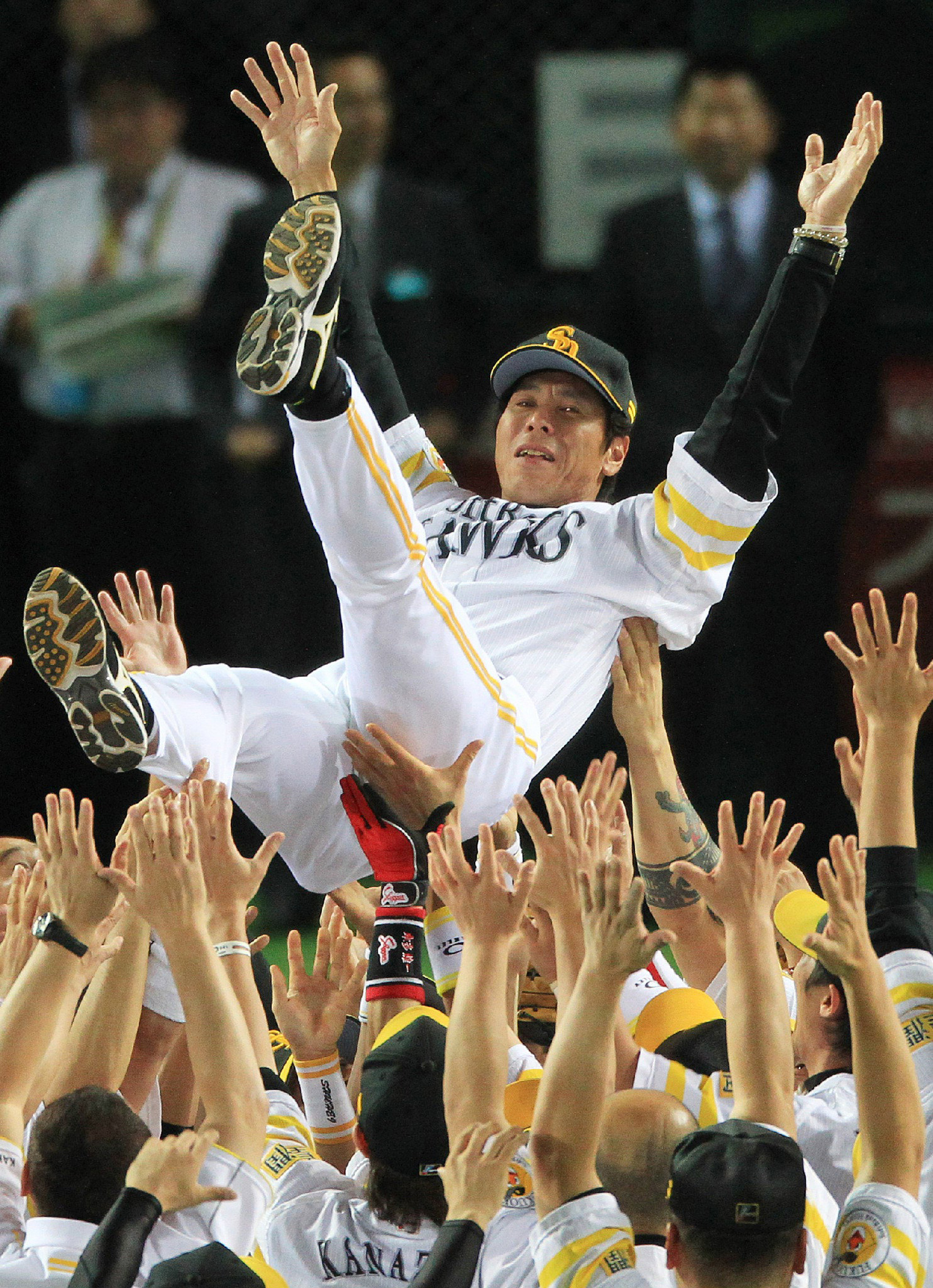 Photo Credit: In a picture taken on November 20, 2011, Pacific League champions Softbank Hawks manager Koji Akiyama is tossed in the air by the Hawks players as they celebrate victory in the Japan Series professional baseball championship in Fukuoka, western Japan. The Hawks defeated Central League champion Chunichi Dragons 3-0 and clinched the Japan Series title 4-3. AFP PHOTO / JIJI PRESS (Photo by JIJI PRESS / JIJI PRESS / AFP) / Japan OUT (Photo credit should read JIJI PRESS/AFP via Getty Images)