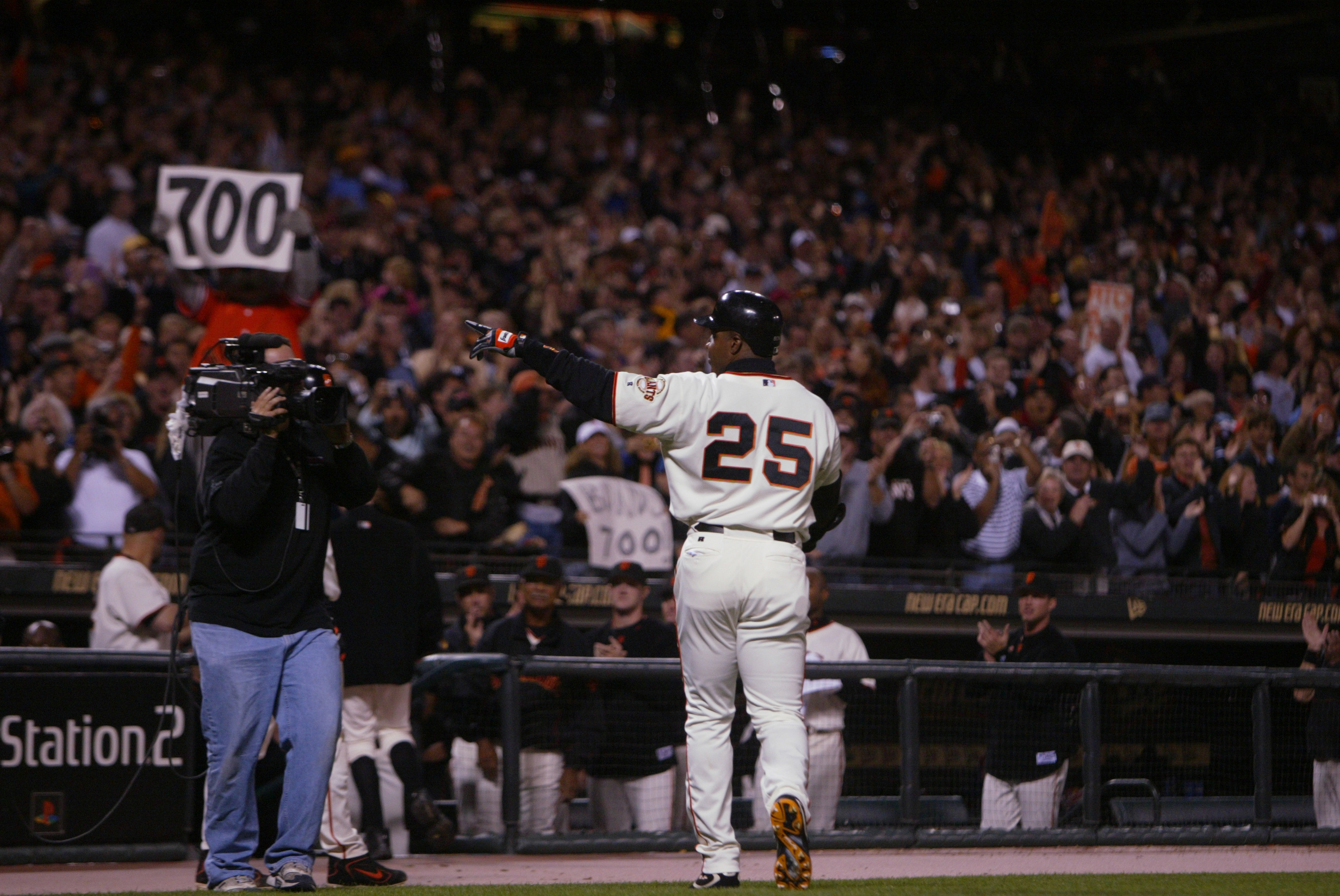 Photo Credit: SAN JOSE MERCURY NEWS PHOTO BY DAI SUGANO–091704 San Francisco Giants #25 Barry Bonds reacts after hitting his 700th home run at the third inning Friday September 17 2004 at SBC Park in San Francisco. (Photo by MediaNews Group/Bay Area News via Getty Images)