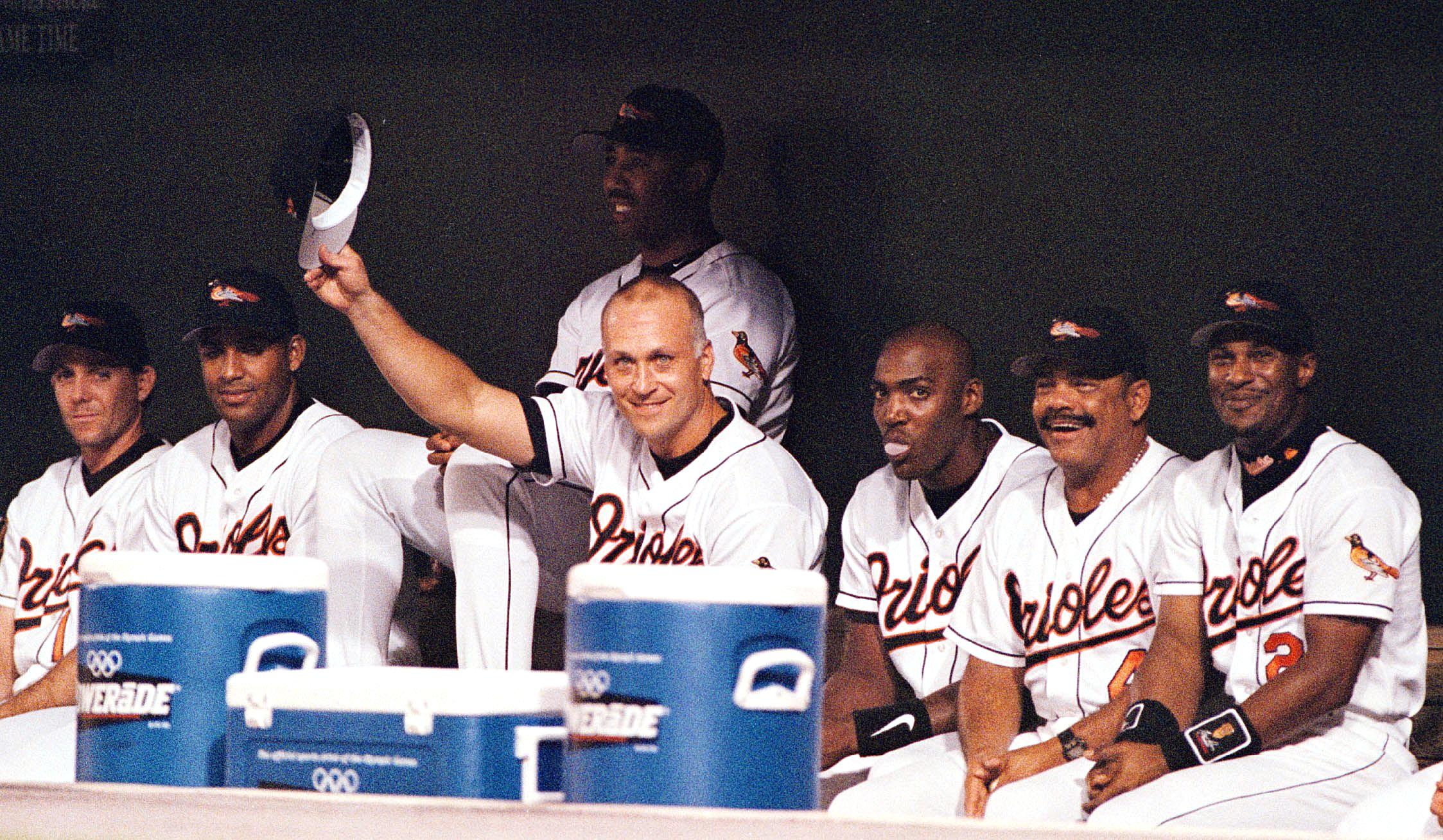 Photo Credit: Baltimore Orioles third baseman Cal Ripken Jr. (C) tips his hat to the New York Yankees players who joined fans at Camden Yards in Baltimore, MD for a standing ovation to acknowledge Ripken’s consecutive game streak which ended 20 September. Ripken said before the game that he planned to end his consecutive game streak in the Orioles’ final home game of the season. By not playing in tonight’s game, Ripken would end his consecutive game streak at 2,632 games, 501 more games than Lou Gehrig. AFP PHOTO Heather HALL (Photo by HEATHER HALL / AFP) (Photo by HEATHER HALL/AFP via Getty Images)