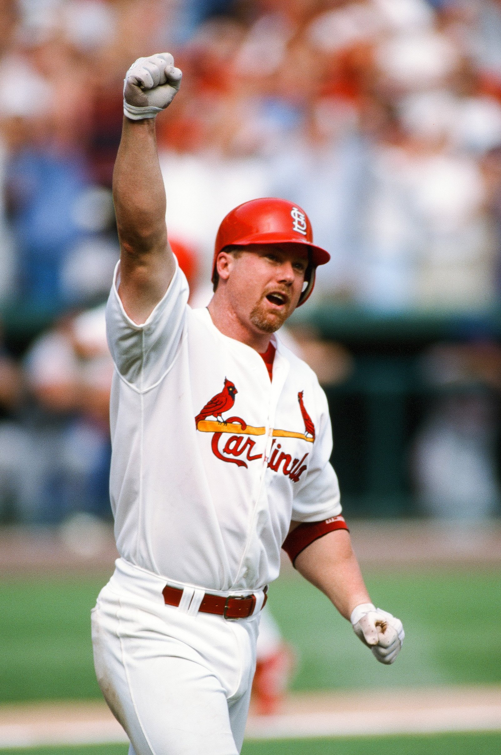 Photo Credit: Mark McGwire of the St. Louis Cardinals celebrates after hitting a home run against the Montreal Expos on September 27, 1998 at Busch Stadium in St. Louis, Missouri. Mark McGwire hit record setting home runs 69 and 70 during this game. (Photo by Sporting News via Getty Images via Getty Images)