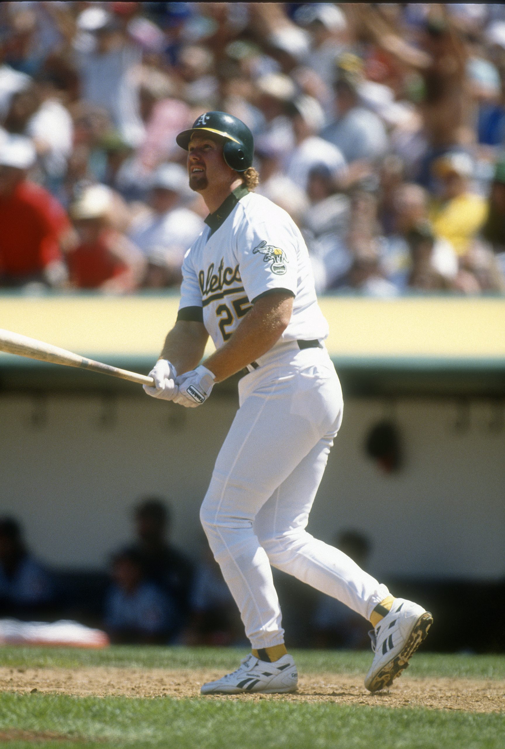 Photo Credit: Mark McGwire #25 of the Oakland Athletics bats during an Major League Baseball game circa 1995 at the Oakland-Alameda County Coliseum in Oakland, California. McGwire played for the Athletics from 1986-1997. (Photo by Focus on Sport/Getty Images)