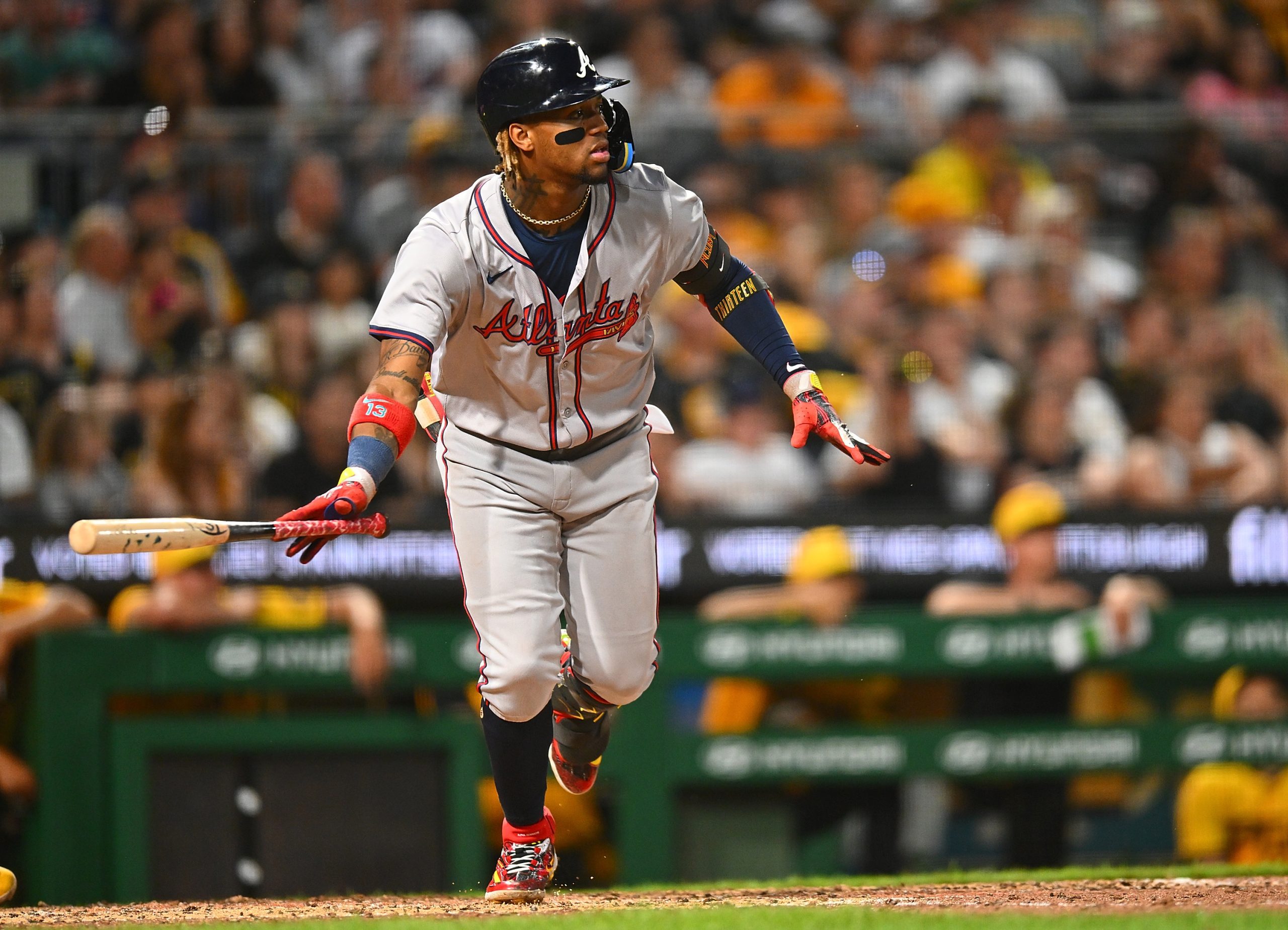 Photo Credit: Ronald Acuña Jr. #13 of the Atlanta Braves hits a three-run home run during the eighth inning against the Pittsburgh Pirates at PNC Park on May 24, 2024 in Pittsburgh, Pennsylvania. (Photo by Joe Sargent/Getty Images)