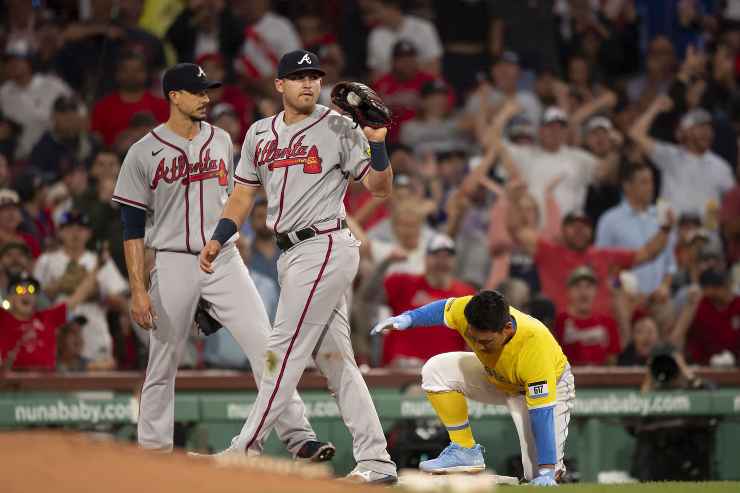 Photo Credit: Austin Riley #27 of the Atlanta Braves reacts after tagging out Masataka Yoshida #7 as he attempts to advance to third base to record the third out of a triple play during the third inning of a game on July 25, 2023 at Fenway Park in Boston, Massachusetts. (Photo by Billie Weiss/Boston Red Sox/Getty Images)