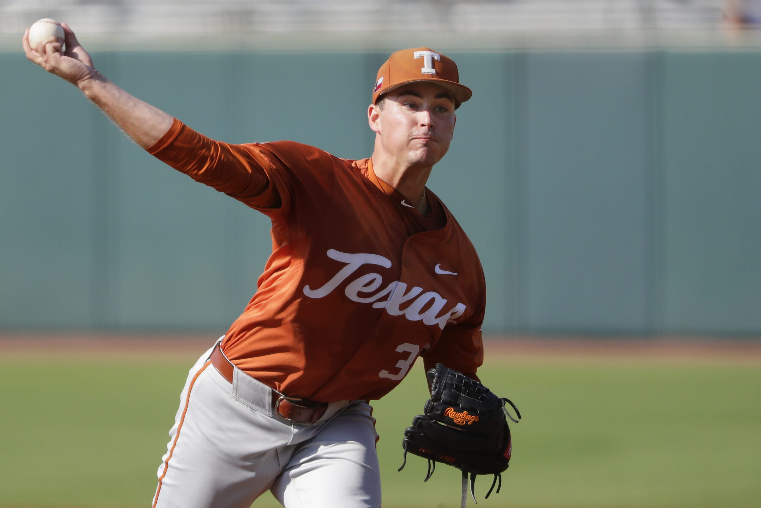 Photo: Texas starting pitcher Max Grubbs throws against Louisiana during an NCAA regional baseball game on Friday, May 31, 2024, in College Station, Texas. (AP Photo/Michael Wyke).