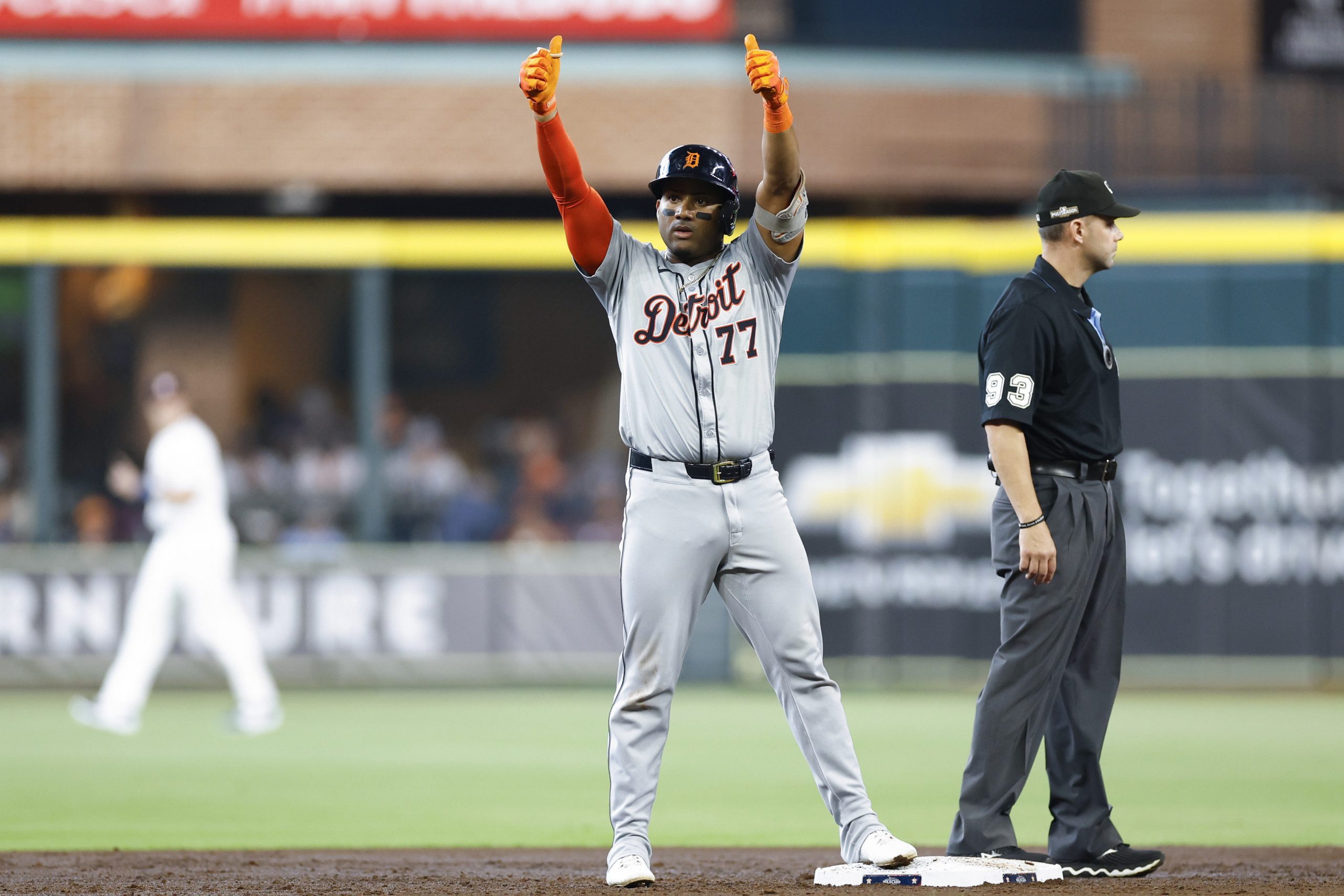 Andy Ibáñez Detroit Tigers celebrates after hitting a double against the Houston Astros in the third inning during Game One of the Wild Card Series. (Photo by Tim Warner/Getty Images)