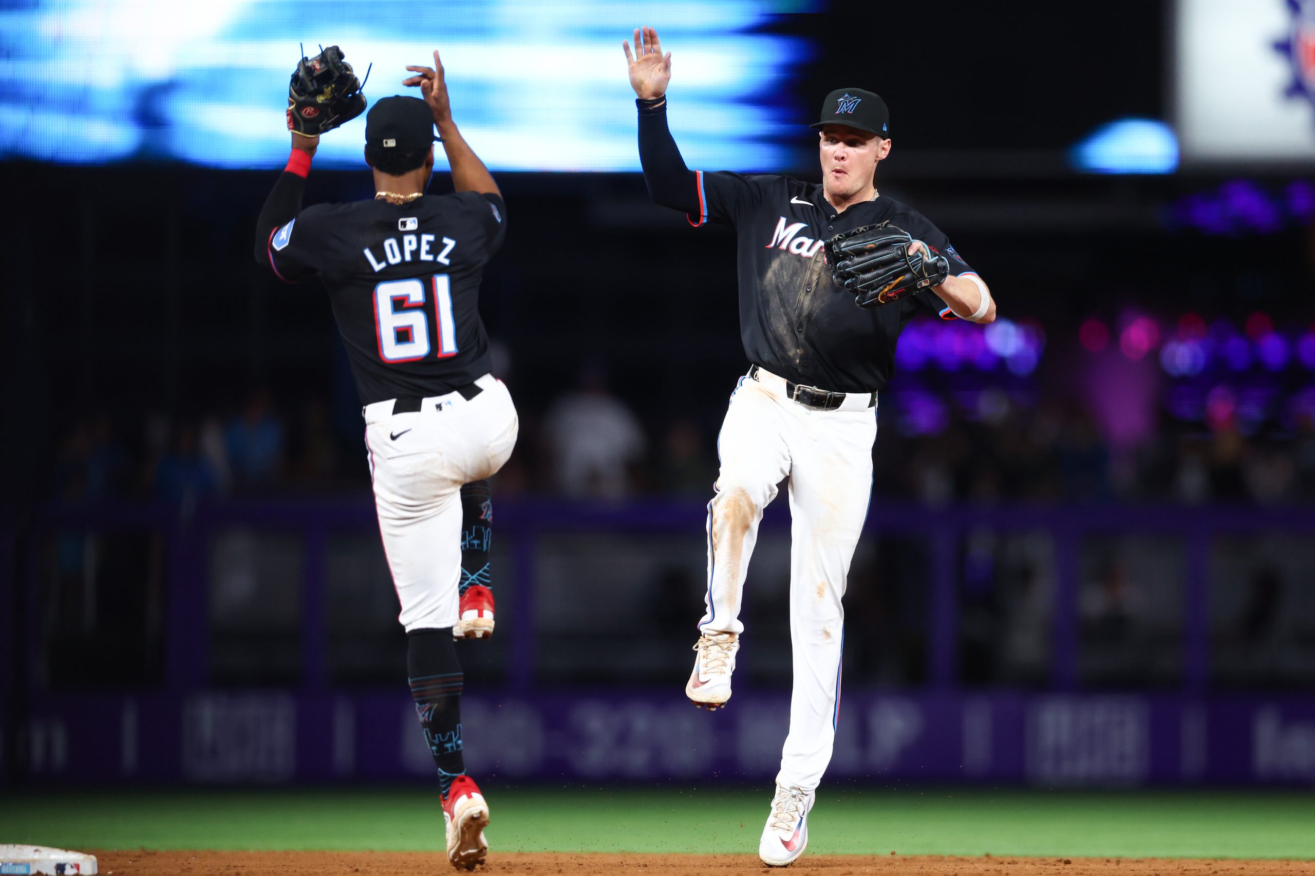 Photo Credit: Otto Lopez #61 and Griffin Conine #56 of the Miami Marlins celebrate after defeating the Atlanta Braves at loanDepot park on September 20, 2024 in Miami, Florida. (Photo by Megan Briggs/Getty Images)