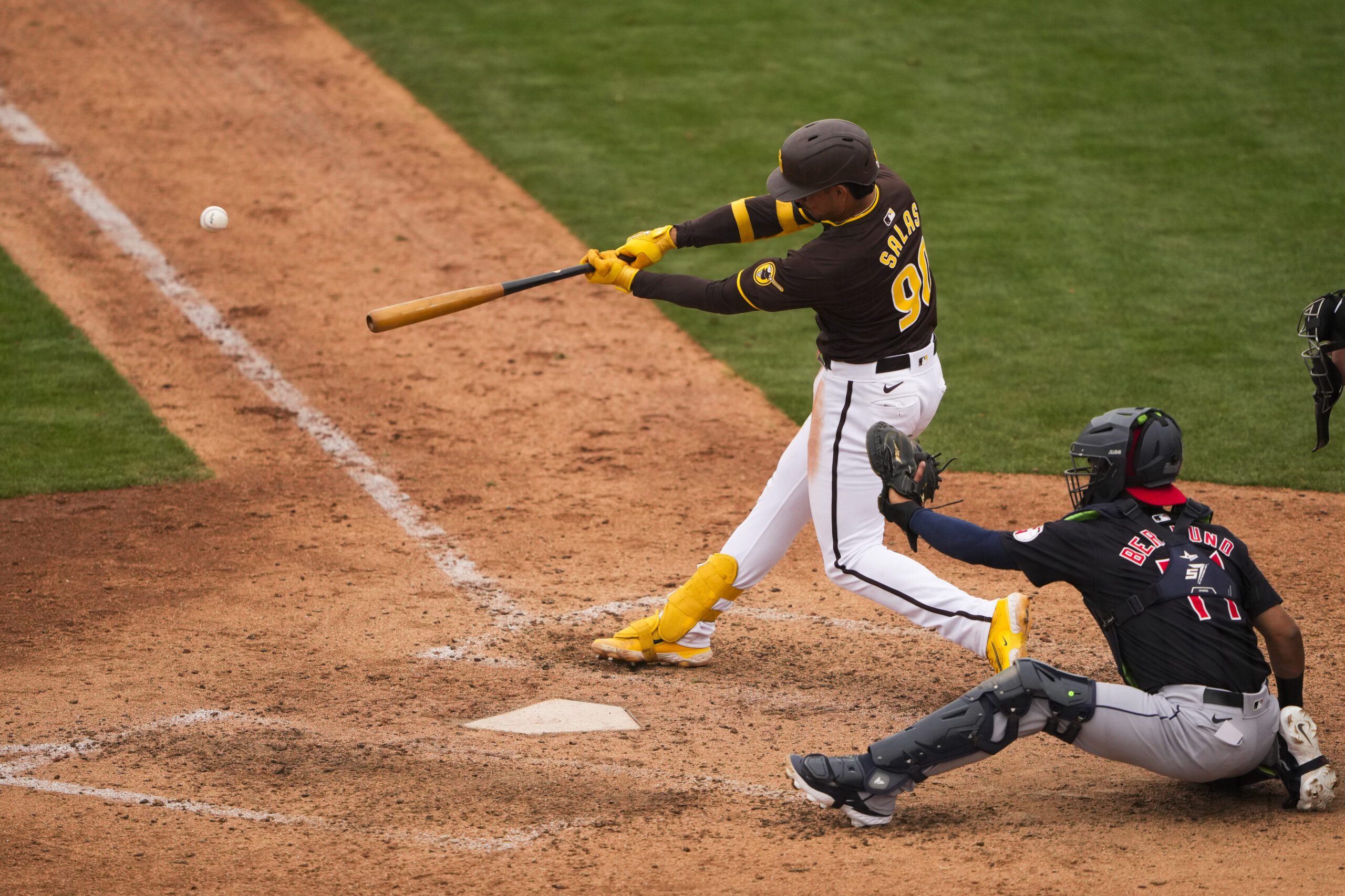 Photo: San Diego Padres’ Ethan Salas hits a single during the ninth inning of a spring training baseball game as Cleveland Guardians catcher Michael Berglund looks on, Monday, Feb. 26, 2024, in Peoria, Ariz. (AP Photo/Lindsey Wasson)