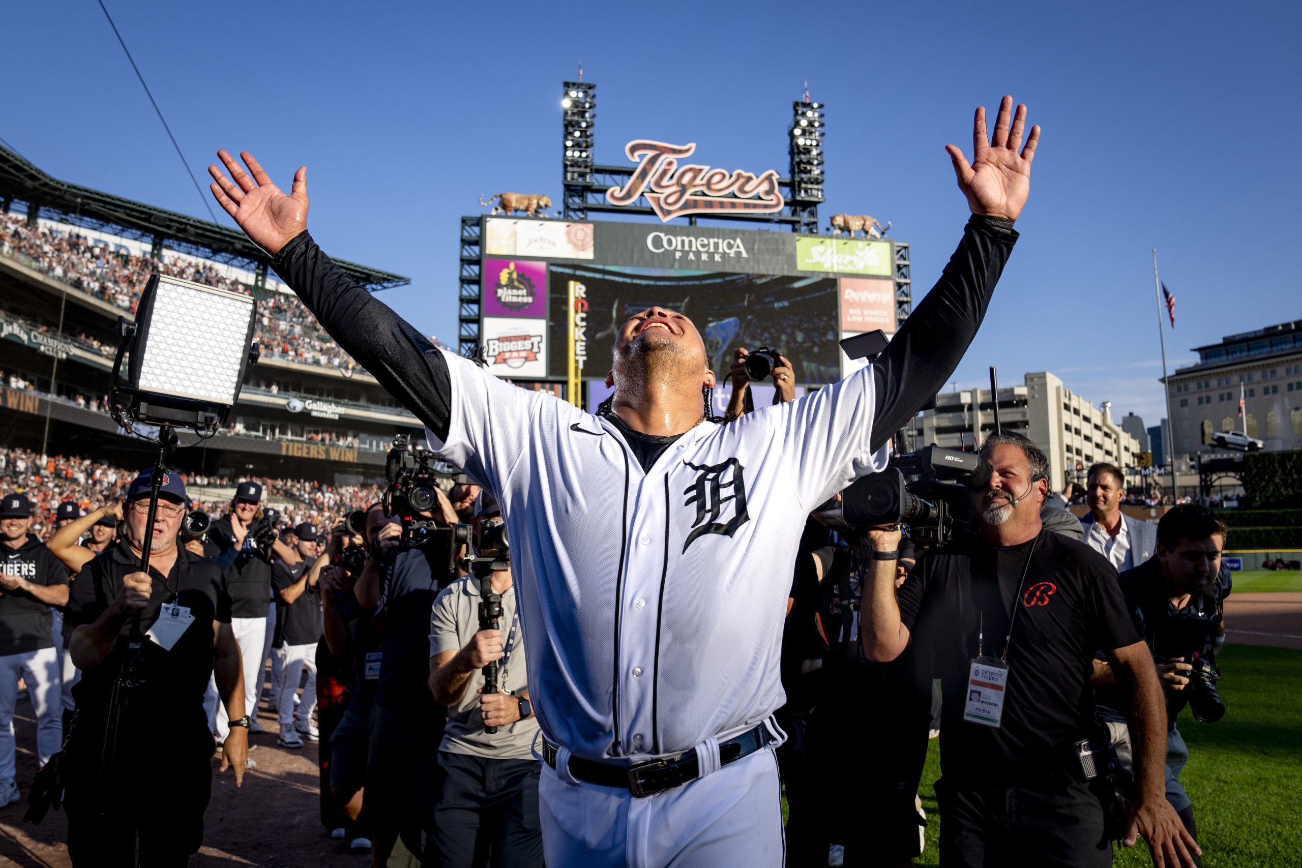Photo Credit: Miguel Cabrera #24 of the Detroit Tigers reacts after his last game ever and win against the Cleveland Guardians at Comerica Park on October 01, 2023 in Detroit, Michigan. (Photo by Nic Antaya/Getty Images)