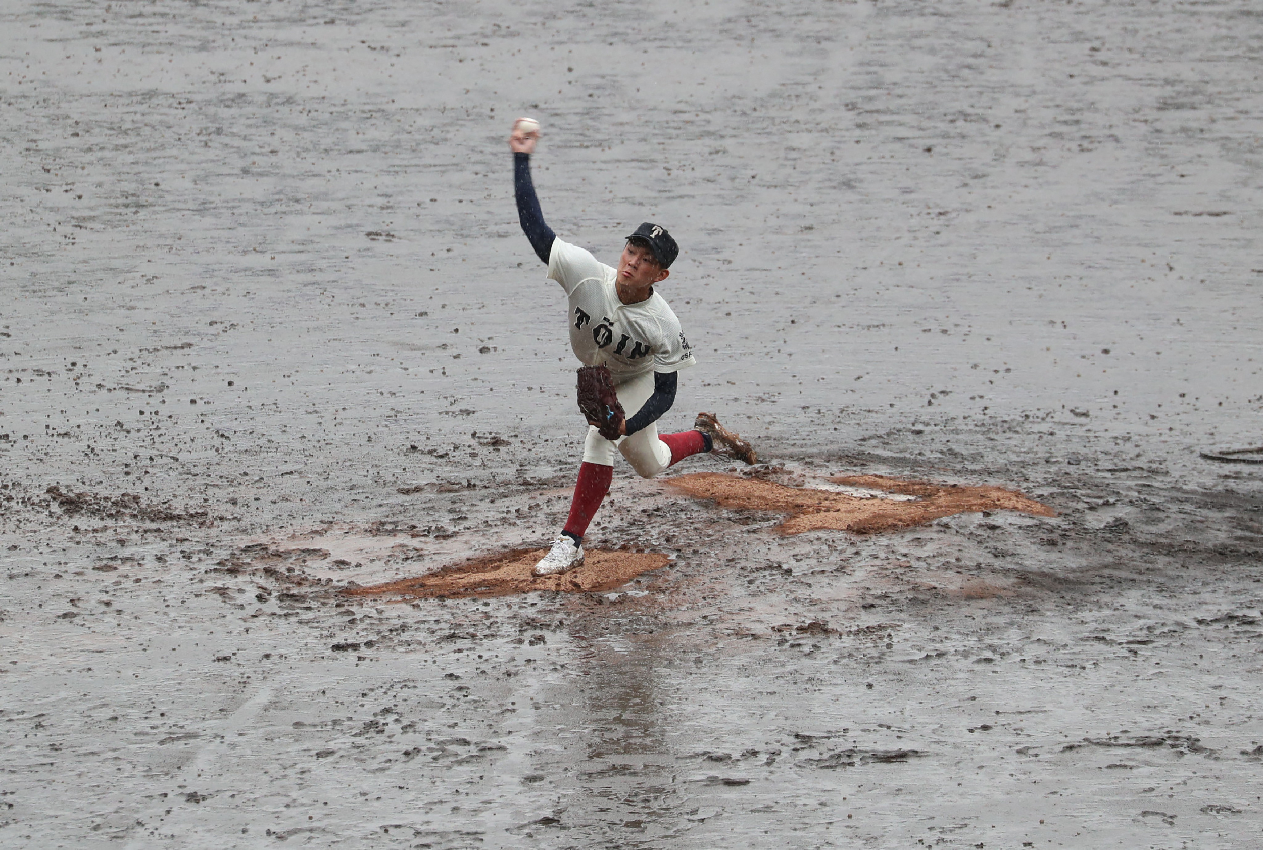 Photo Credit: Osaka Toin Senior High School pitcher Hayato Takenaka throws a pitch in the rain while surrounded by a muddy infield. (Photo by JIJI PRESS / AFP) / Japan OUT (Photo by STR/JIJI PRESS/AFP via Getty Images)