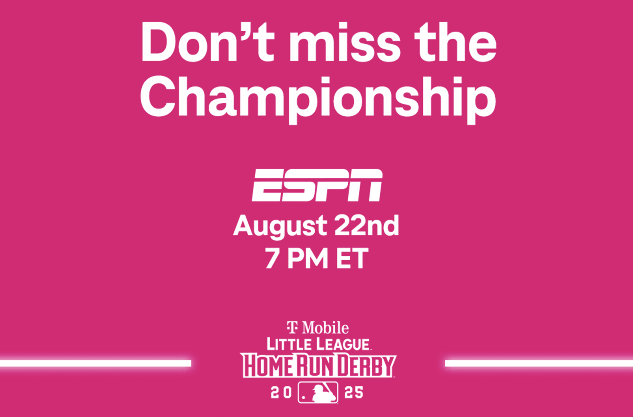 SOUTH WILLIAMSPORT, Pa. (July 23, 2025) – The stage is set and the sluggers are ready as Little League® International has officially announced the finalists for the 2025 T-Mobile Little League® Home Run Derby Championship. The event will take place on Thursday, August 21, at 5 p.m. ET at Volunteer Stadium in Williamsport, Pennsylvania, during the Little League Baseball World Series Presented by T-Mobile. Fans can catch the televised event on ESPN the following evening, Friday, August 22, at 7 p.m. ET.