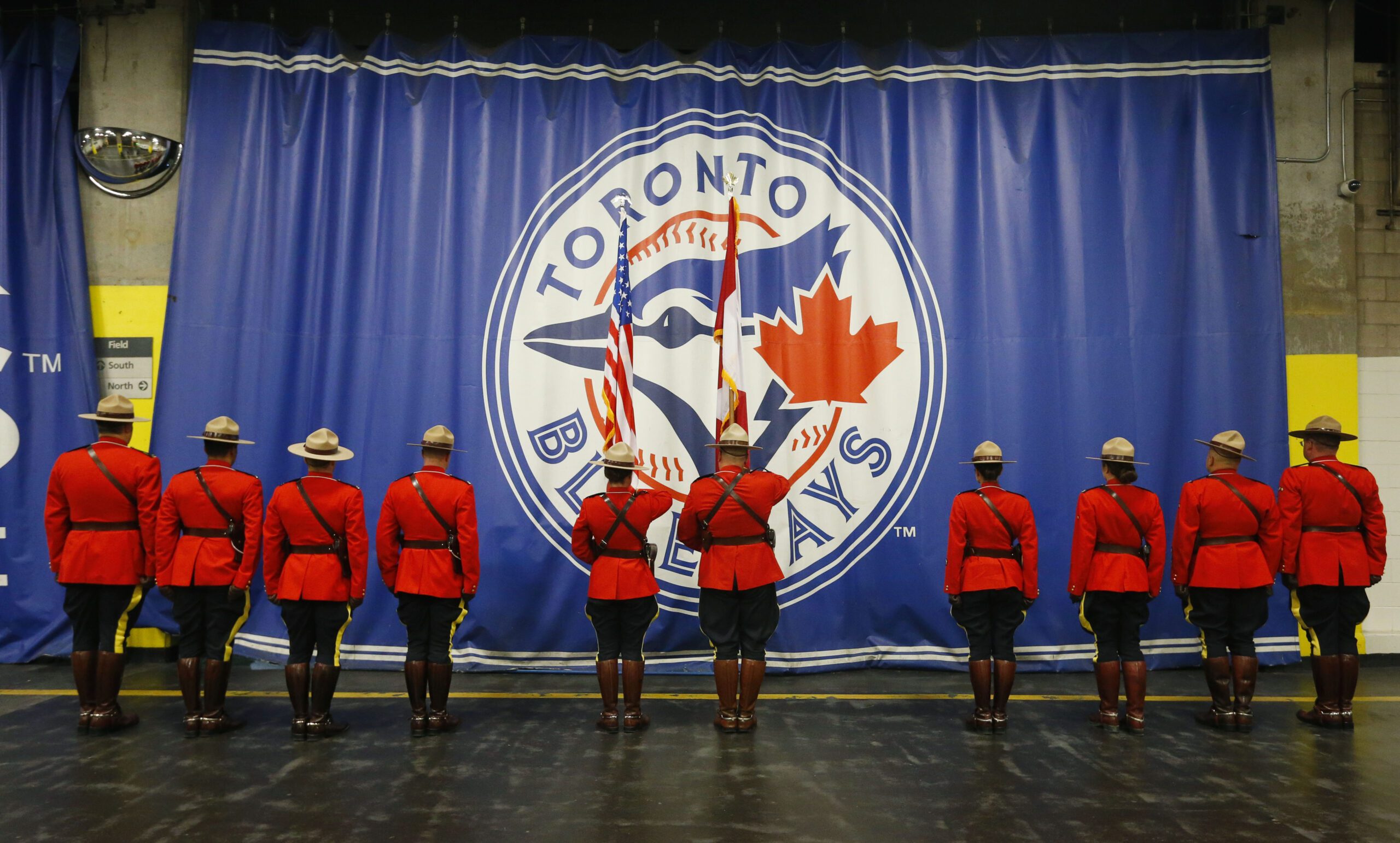 Photo: Members of the Royal Canadian Mounted Police march in front of the Toronto Blue Jays logo before Game 4 of baseball’s American League Championship Series against the Kansas City Royals on Tuesday, Oct. 20, 2015, in Toronto. (AP Photo/Paul Sancya)