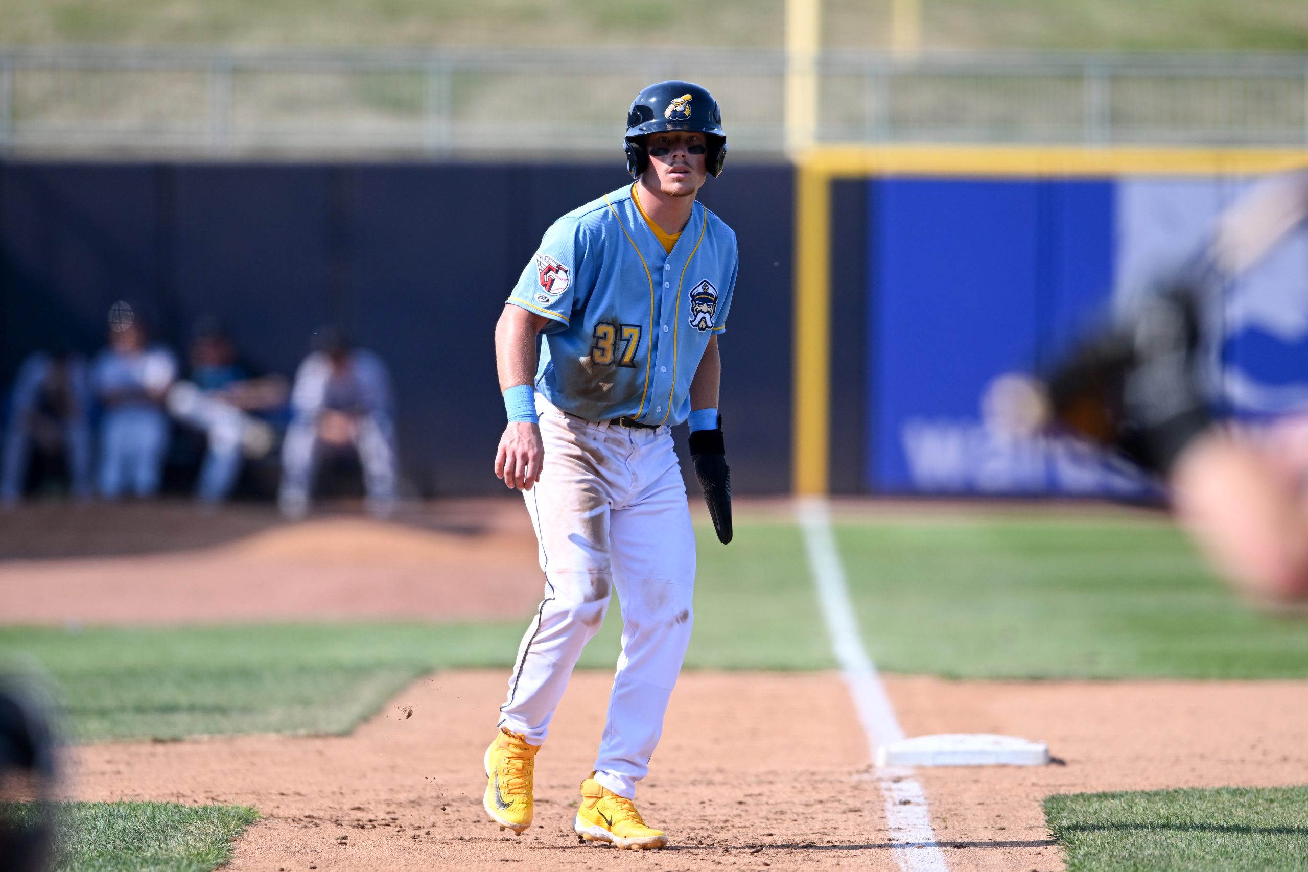 Photo Credit: Travis Bazzana #37 of the Lake County Captains takes a lead at third base. (Photo by Nick Cammett/Diamond Images via Getty Images)
